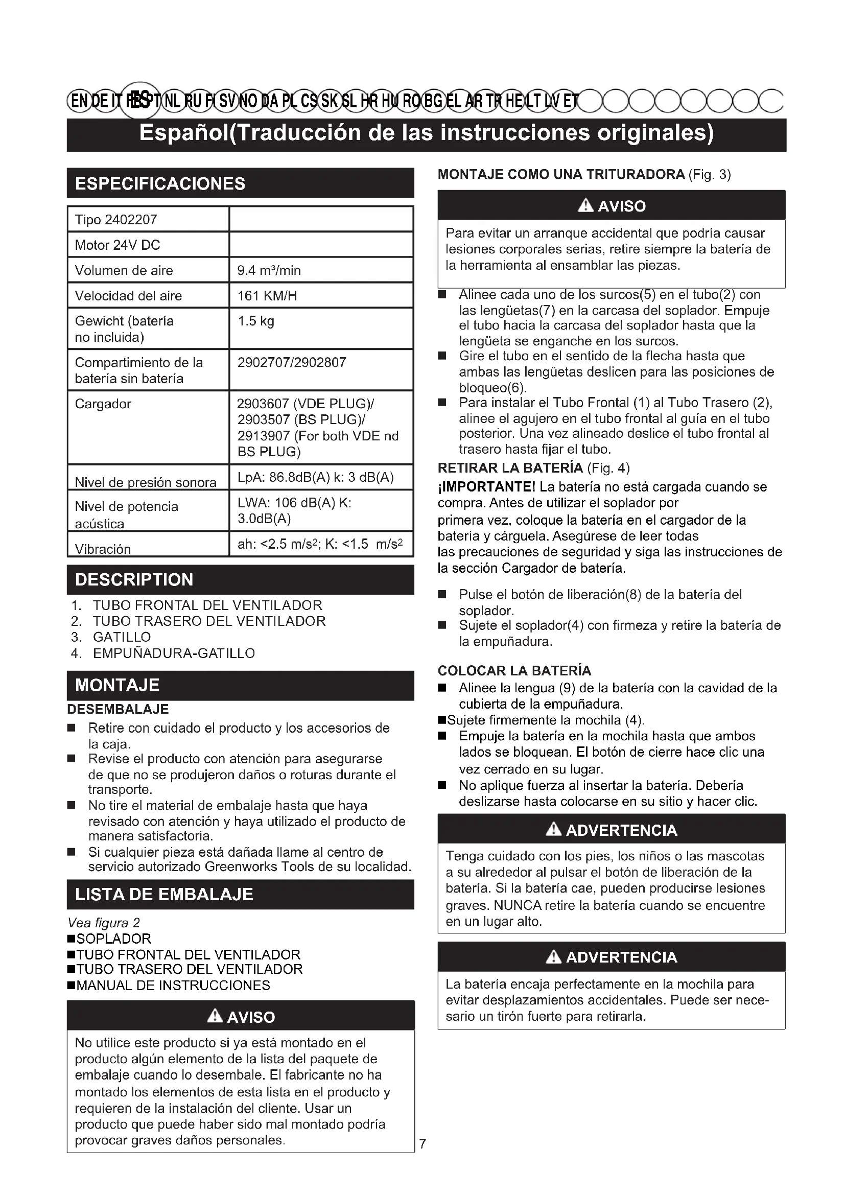 EN DE IT FR PT NL RU FI SV NO DA PL CS SK SL HR HU RO BG EL AR TR HE LT LV ET Asegúrese de que la batería está instalada en el soplador. Apriete el botón para arrancar el soplador. Suelte el botón para pararlo. AVERTISSEMENT Pour éviter de vous blesser gravement, portez deslunettes de sécurité en tout temps lorsque vous utilisez&YX\]antipoussière dans les endroits poussiéreux. AVERTISSEMENT Pour éviter de vous blesser gravement oud’endommager l’appareil, assurez-vous que les tubes&^place avant de démarrer l’appareil.FUNCIONAMIENTO DEL SOPLADOR Para evitar la dispersión de los escombros, dirija el soplador hacia los bordes exteriores de un montón de escombros. Nunca dirija el soplador directamente al centro de un montón de escombros. Para reducir los niveles de ruido, limite el número de piezas del equipo que se utilicen al mismo tiempo. Use rastrillos y escobas para esparcir los desechos antes de utilizar el soplador. En condiciones de polvo, humedezca ligeramente la superficie cuando haya agua disponible. Ahorre agua utilizando sopladores en lugar de mangueras para muchas aplicaciones de césped y jardín, incluyendo áreas tales como canalones, pantallas, enrejados, barbacoas, porches y jardines. Preste especial atención a los niños, mascotas, ventanas abiertas, o coches, cuando vaya a utilizar el soplador. Después de usar sopladores u otros equipos, limpie la zona. Deshágase de los desechos adecuadamente. MANTENIMIENTO ADVERTENCIA _#`incendios y descargas eléctricas, retire la batería antes de ajustar, inspeccionar o limpiar el ventilador.LIMPIEZA DE LA BOLSA DE RECOGIDAExtraiga la batería. Cepille o sople el polvo y la suciedad de las rejillas de ventilación con aire comprimido o una aspiradora. Mantenga los orificios de ventilación libres de obstrucciones, aserrín y astillas de madera. No rocíe, lave ni sumerja las salidas de aire en agua. Limpie la carcasa y los componentes de plástico con un paño húmedo y suave. No utilice disolventes ADVERTENCIA +#reducir el riesgo de descarga eléctrica o incendio: Vuelva a colocar la batería o el cargador de inmediato si la caja de la batería o el cable del cargador están estropeados. Compruebe que el interruptor está en posición de apagado (OFF) antes de introducir o retirar la batería. Compruebe que la batería está retirada y el interruptor está en la posición de apagado antes de inspeccionar, ajustar o realizar el mantenimiento de cualquier parte del soplador. Lea, comprenda y siga las instrucciones contenidas en la sección titulada Procedimiento de carga. UTILIZACIÓN AVERTISSEMENT Aun cuando esté familiarizado con el aparato no dejede estar atento. No olvide nunca que basta con unsegundo de inatención para herirse gravemente. AVERTISSEMENT Use siempre gafas de protección con protección lateral que cumplan la normas ANSI Z87.1, junto con protección auditiva. Si no sigue estas recomendaciones, podrían entrar objetos extraños en los ojos y podría sufrir otras lesiones graves. AVERTISSEMENT No utilice conexiones ni accesorios que no estén recomendados por el fabricante de este producto. El uso de conexiones o accesorios no recomendados podría causar graves daños personales. Antes de cada uso, inspeccione todo el producto para comprobar si hay piezas dañadas, extraviadas o sueltas como tornillos, tuercas, pernos, tapas, etc. Apriete bien todos los tornillos y las tapas y no haga funcionar el producto hasta que todas las partes que faltan o dañadas sean reemplazadas.CÁRGUELO ANTES DE USARLO POR PRIMERA VEZ. AVERTISSEMENT Retire siempre la batería del producto cuanto esté instalando piezas, haciendo ajustes, limpiándolo o cuando no esté en uso. Retirar la batería evitará un arranque accidental que puede provocar lesiones personales graves.ARRANCAR/PARAR EL SOPLADOR/LATRITURADORAAntes de empezar, asegúrese de que el soplador se encuentra en perfecto estado para garantizar un uso seguro del mismo. 8Español(Traducción de las instrucciones originales)
