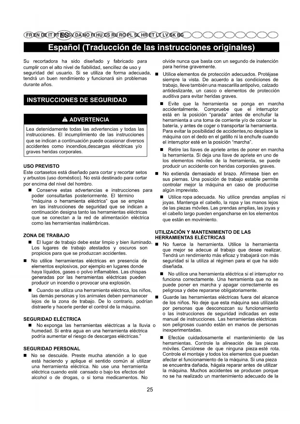FR EN DE IT PT NL SV DA NO FI HU CS RU RO PL SL HR ET LT LV SK BG alineación de las piezas móviles. Cerciórese de que ninguna pieza esté rota. Controle el montaje y todos los elementos que puedan afectar el funcionamiento de la herramienta. El cárter de la hoja o cualquier otro elemento dañado deben ser reparado o substituido en un Centro de Servicio Posventa, salvo indicación contraria en este manual de instrucciones. Mantenga las manos lejos de la hoja para no cortarse. No trate de retirar o sostener el material cortado cuando la hoja esté en movimiento. Cerciórese de haber retirado la batería y de no estar presionando el gatillo antes de retirar un elemento atascado en la hoja. No toque la hoja cuando coja la herramienta. ADVERTENCIA Las hojas siguen girando durante un momento después de apagar la unidad. Mantenga las manos, el rostro y los pies lejos de las piezas móviles. No trate de tocar o de detener la hoja cuando esté en movimiento. Detenga siempre el motor cuando no esté cortando o cuando se desplace de una zona de trabajo a otra. No deje que se acumulen en la herramienta vegetales y demás materiales resultantes del corte. De acumularse podrían atascar la hoja. Guarde la herramienta en un lugar seco, elevado o cerrado con llave para que no lo utilicen personas inexpertas que pudieran dañarlo. Guarde la máquina fuera del alcance de los niños o de personas inexpertas. Coloque la funda de protección de la hoja cuando no utilice el cortasetos. No sumerja ni salpique la herramienta con agua o cualquier otro líquido. Las empuñaduras siempre deben estar secas, limpias y sin restos vegetales. Limpie la máquina después de cada utilización. Consulte las instrucciones de la sección “Guardar el cortasetos”. Cerciórese de que las piezas de la máquina estén bien apretadas antes de transportarla. No pierda este manual de instrucciones. Consúltelo a menudo y utilícelo para informar a otros posibles usuarios. Si presta el cortasetos, entregue también este manual de instrucciones. REPARACIONES Las reparaciones deben quedar en manos de un técnico cualificado. El mantenimiento o las reparaciones realizadas por personas no cualificadas aumentan el riesgo de heridas corporales graves o de daños en la máquina. El incumplimiento de esta instrucción anula y cancela la garantía. Cuando se realizan operaciones de mantenimiento, sólo se deben emplear piezas de recambio originales. Siga escrupulosamente las instrucciones que se indican en la sección Mantenimiento del presente manual. De este modo reducirá el riesgo de heridas corporales graves y la posibilidad de dañar la máquina. El incumplimiento de esta instrucciónanula y cancela la garantía. ADVERTENCIA Si faltara alguna pieza, no utilice la herramienta hasta haber colocado la pieza en cuestión . El incumplimiento de esta recomendación puede provocar heridas corporales graves. C O N S E R V E E S T A S I N S T R U C C I O N E S. CONSÚLTELAS A MENUDO Y UTILÍCELAS PARA IN FOR M A R A OTR OS P OS IB LE S U S U A R IOS. SI PRESTA LA HERRAMIENTA, ENTREGUE TAMBIÉN ESTE MANUAL DE INSTRUCCIONES. 28Español (Traducción de las instrucciones originales)