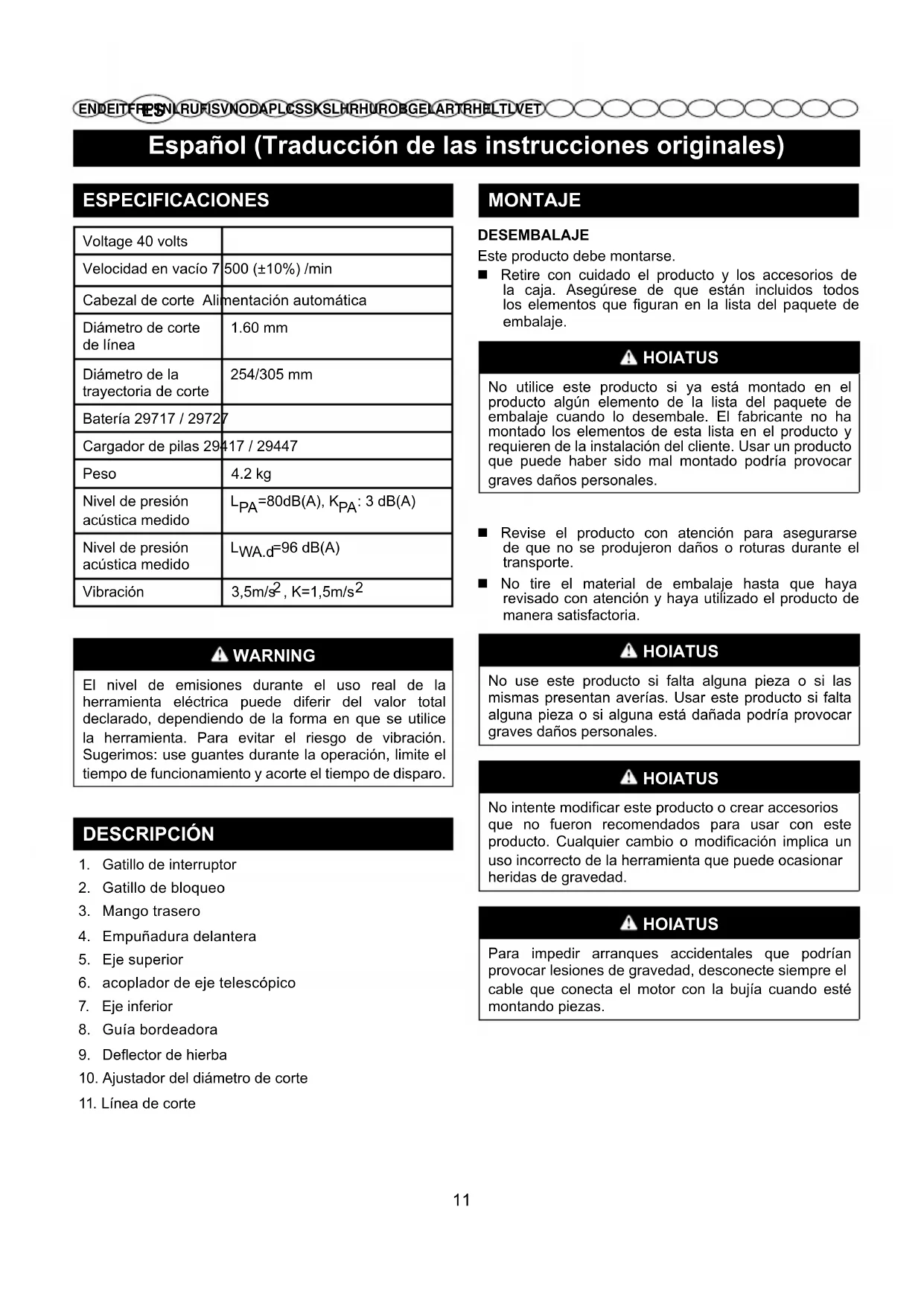 EN DE IT FR PT NL RU FI SV NO DA PL CS SK SL HR HU RO BG EL AR TR HE LT LV ET ESPECIFICACIONES Voltage 40 volts Velocidad en vacío 7,500 (±10%) /min Cabezal de corte Alimentación automática Diámetro de corte de línea