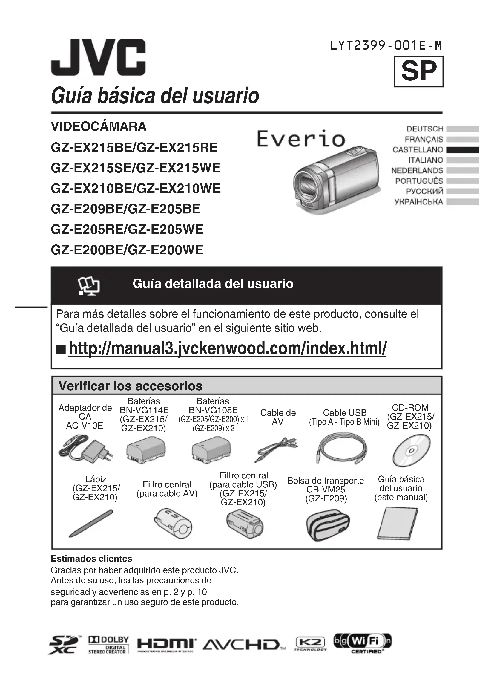 Guía básica del usuario(este manual)Filtro central(para cable AV)Lápiz(GZ-EX215/GZ-EX210)CD-ROM(GZ-EX215/GZ-EX210)Cable de Cable USB(Tipo A - Tipo B Mini)BateríasBN-VG108E(GZ-E205/GZ-E200) x 1(GZ-E209) x 2BateríasBN-VG114E(GZ-EX215/GZ-EX210)Adaptador de AC-V10EVerificar los accesoriosFiltro central(para cable USB)(GZ-EX215/GZ-EX210)Bolsa de transporteCB-VM25(GZ-E209)