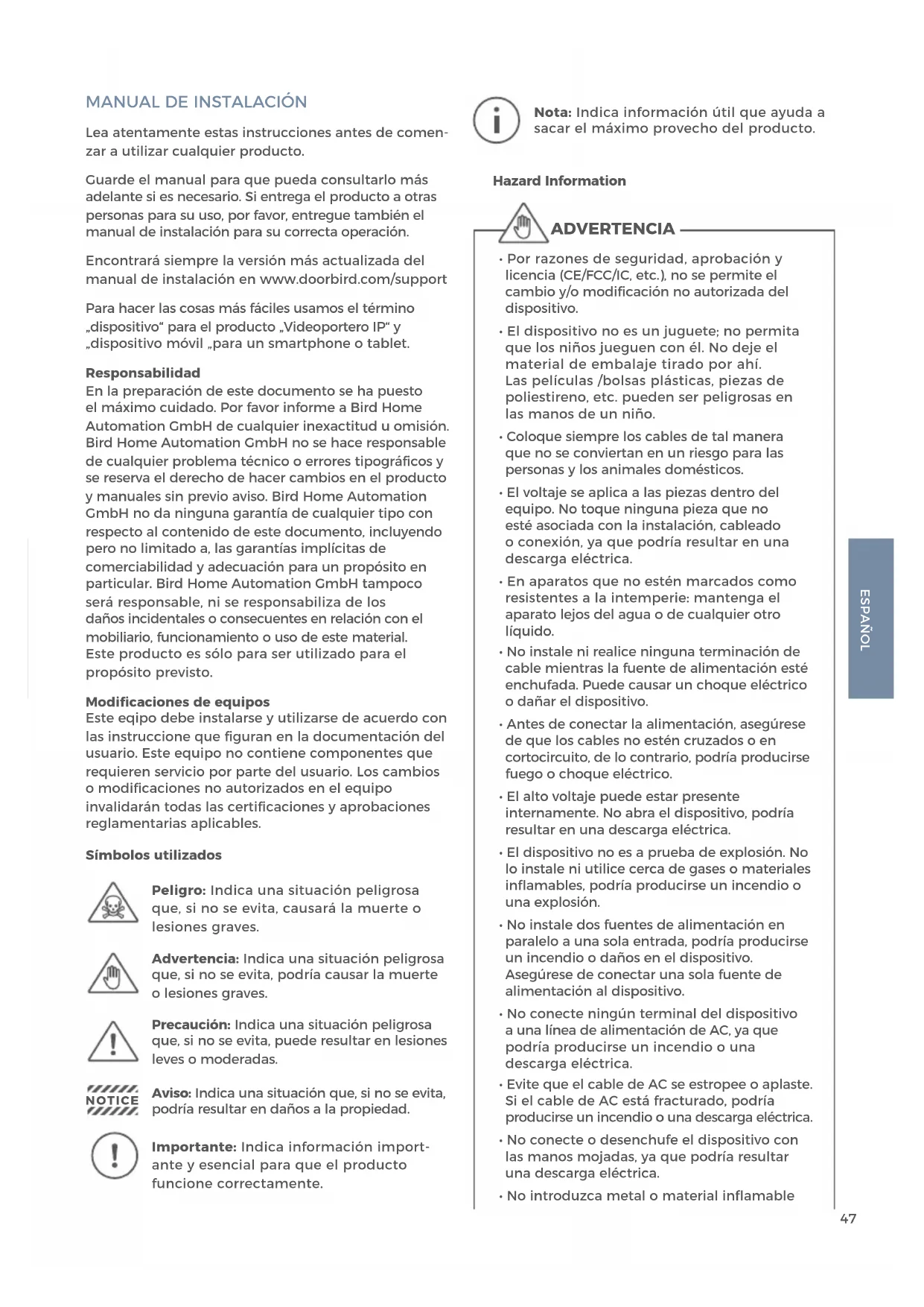 Lea atentamente estas instrucciones antes de comen- zar a utilizar cualquier producto. Guarde el manual para que pueda consultarlo más adelante si es necesario. Si entrega el producto a otras personas para su uso, por favor, entregue también el manual de instalación para su correcta operación. Encontrará siempre la versión más actualizada del manual de instalación en www.doorbird.com/support Para hacer las cosas más fáciles usamos el término „dispositivo“ para el producto „Videoportero IP“ y „dispositivo móvil „para un smartphone o tablet. Responsabilidad En la preparación de este documento se ha puesto el máximo cuidado. Por favor informe a Bird Home Automation GmbH de cualquier inexactitud u omisión. Bird Home Automation GmbH no se hace responsable de cualquier problema técnico o errores tipográficos y se reserva el derecho de hacer cambios en el producto y manuales sin previo aviso. Bird Home Automation GmbH no da ninguna garantía de cualquier tipo con respecto al contenido de este documento, incluyendo pero no limitado a, las garantías implícitas de comerciabilidad y adecuación para un propósito en particular. Bird Home Automation GmbH tampoco será responsable, ni se responsabiliza de los daños incidentales o consecuentes en relación con el mobiliario, funcionamiento o uso de este material. Este producto es sólo para ser utilizado para el propósito previsto. Modificaciones de equipos Este eqipo debe instalarse y utilizarse de acuerdo con las instruccione que figuran en la documentación del usuario. Este equipo no contiene componentes que requieren servicio por parte del usuario. Los cambios o modificaciones no autorizados en el equipo invalidarán todas las certificaciones y aprobaciones reglamentarias aplicables. Símbolos utilizados Precaución: Indica una situación peligrosa que, si no se evita, puede resultar en lesiones leves o moderadas. Peligro: Indica una situación peligrosa que, si no se evita, causará la muerte o lesiones graves. Advertencia: Indica una situación peligrosa que, si no se evita, podría causar la muerte o lesiones graves.