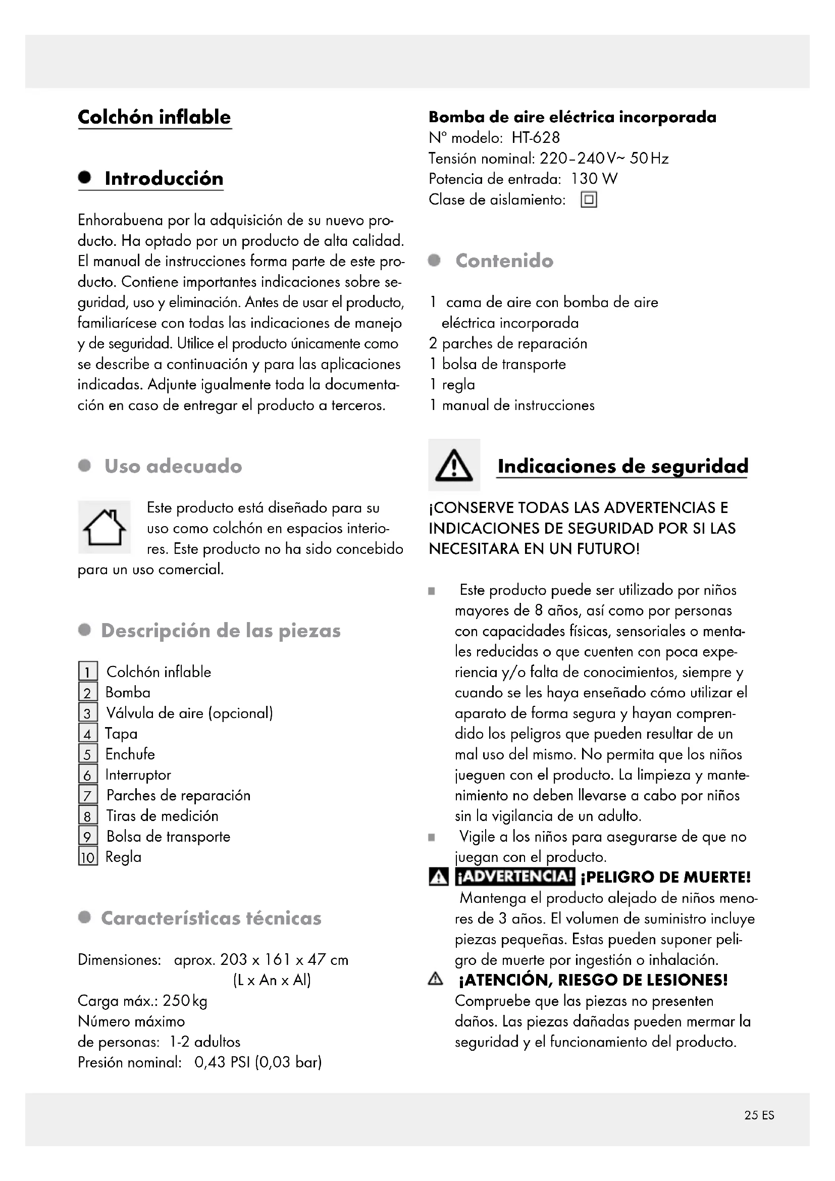 Nota: La elasticidad del material de la cama de aire puede verse afectada por la temperatura ambiente. La elasticidad del material de la cama de aire se verá reducida si la temperatura ambiental es más baja (no obstante, esto es normal y sigue siendo seguro siempre que la temperatura ambiental no baje de los 15°C). Por este motivo es posible que cuando está hinchada la cama sea unos centímetros más pequeña que los datos indicados.