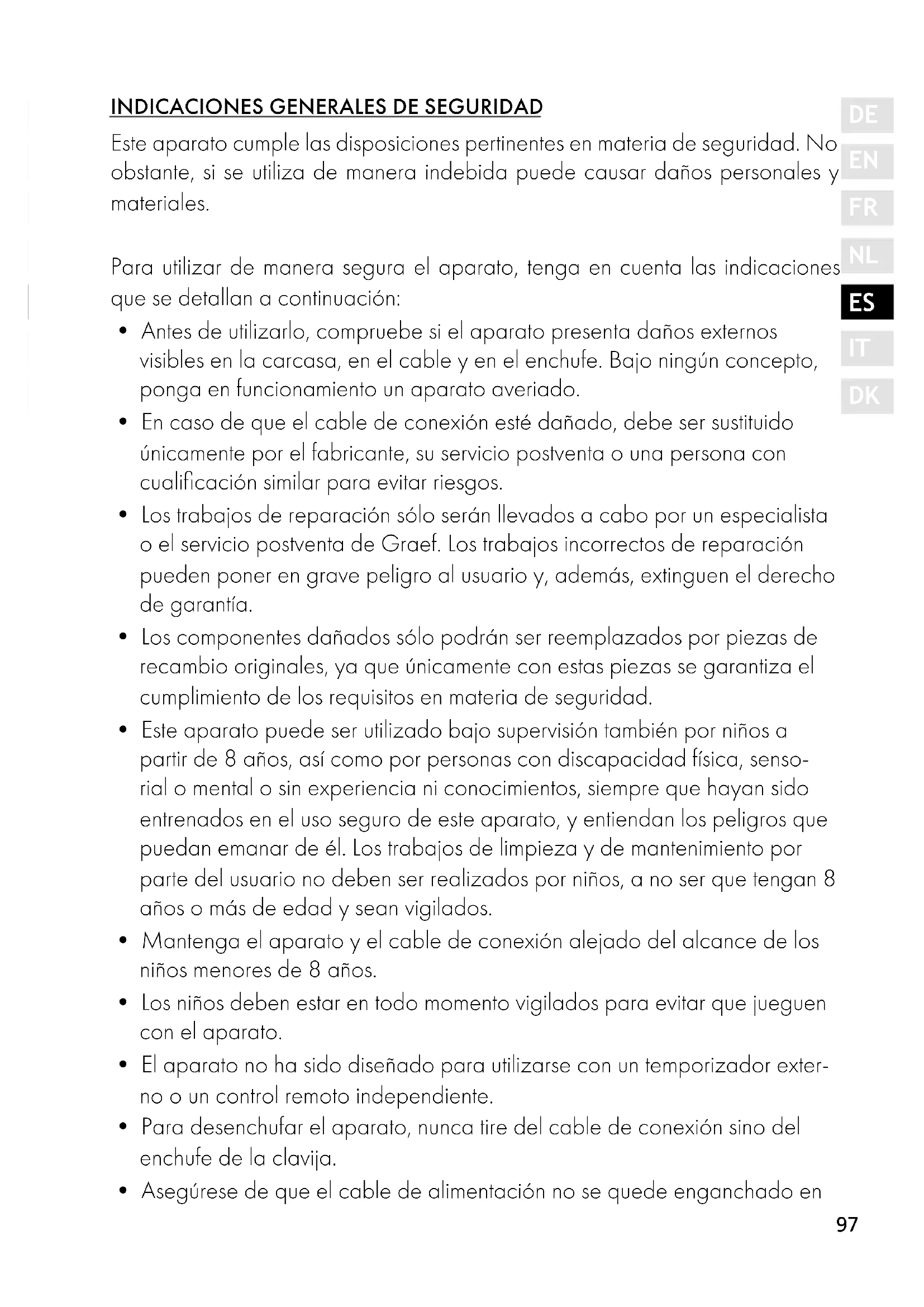 - Limpieza del aparato. Conserve el presente manual de instrucciones y facilítelo junto con el aparato a las terceras personas que vayan a utilizarlo en el futuro. Este manual de instrucciones no puede tener en cuenta todos los aspectos imaginables. Para más información o en caso de problemas que no se traten en este manual de instrucciones o no se traten con suficiente detalle, diríjase al servicio de atención al cliente de Graef o a su distribuidor especializado. ADVERTENCIAS En el presente manual de instrucciones se utilizan las siguientes indicaciones de advertencia y palabras clave: ADVERTENCIA Indica una situación potencialmente peligrosa. El incumplimiento de esta indicación puede producir lesiones de gravedad o provocar incluso la muerte. PRECAUCIÓN Indica una situación potencialmente peligrosa. En caso de incumplimiento de la indicación se pueden producir daños materiales. ¡IMPORTANTE! Indica consejos de uso y otras informaciones de especial importancia.101