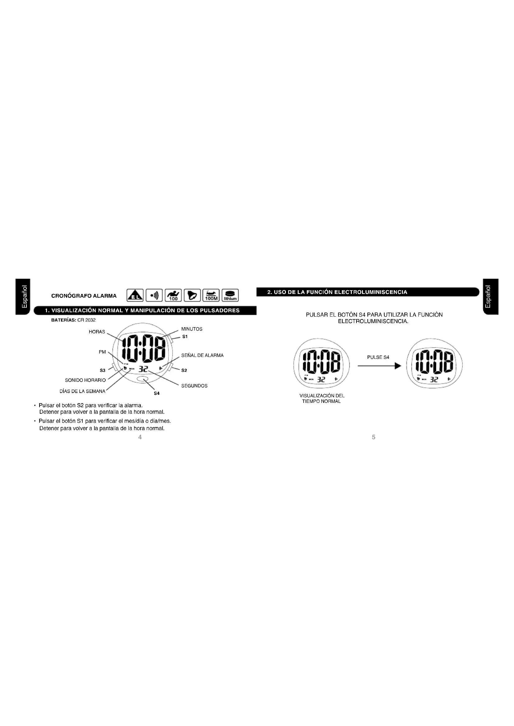 - Pulsar el botón S1 para verificar el mes/día o día/mes. Detener para volver a la pantalla de la hora normal. PULSAR EL BOTÓN S4 PARA UTILIZAR LA FUNCIÓN ELECTROLUMINISCENCIA.Español