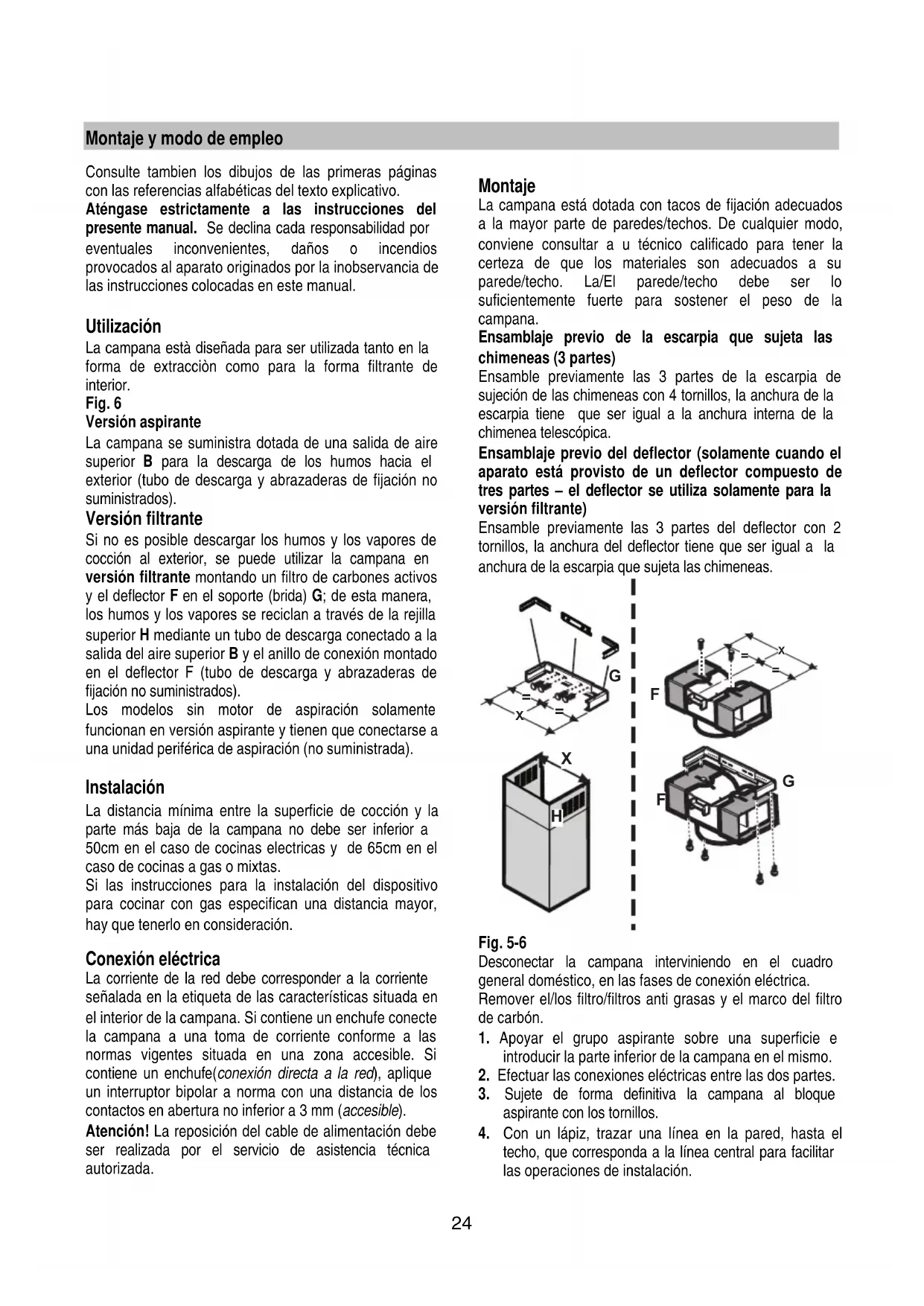 (tubo y abrazaderas no suministrados, se tienen que comprar) al anillo de conexión ubicado encima de la unidad del motor aspirante. El otro extremo del tubo tiene que conectarse a un dispositivo de expulsión de los humos hacia el exterior en caso de uso de la campana en versión aspirante. Si se desea utilizar la campana en versión filtrante, entonces sujete a la escarpia de sujeción de la chimenea G el deflector F y conecte el otro extremo del tubo a la junta de unión situada en el deflector F.