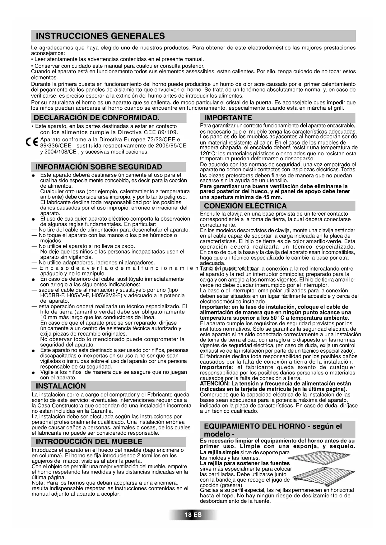 - Conservar con cuidado este manual para cualquier consulta posterior. Cuando el aparato està en funcionamento todos sus elementos assessibles, estan calientes. Por ello, tenga cuidado de no tocar estos elementos. Durante la primera puesta en funcionamiento del horno puede producirse un humo de olor acre causado por el primer calentamiento del pegamento de los paneles de aislamiento que envuelven el horno. Se trata de un fenómeno absolutamente normal y, en caso de verificarse, es preciso esperar a la extinción del humo antes de introducir los alimentos. Por su naturaleza el horno es un aparato que se calienta, de modo particular el cristal de la puerta. Es aconsejable pues impedir que los niños puedan acercarse al horno cuando se encuentre en funcionamiento, especialmente cuando está en márcha el grill. INSTRUCCIONES GENERALES 18 ES DECLARACIÓN DE CONFORMIDAD.