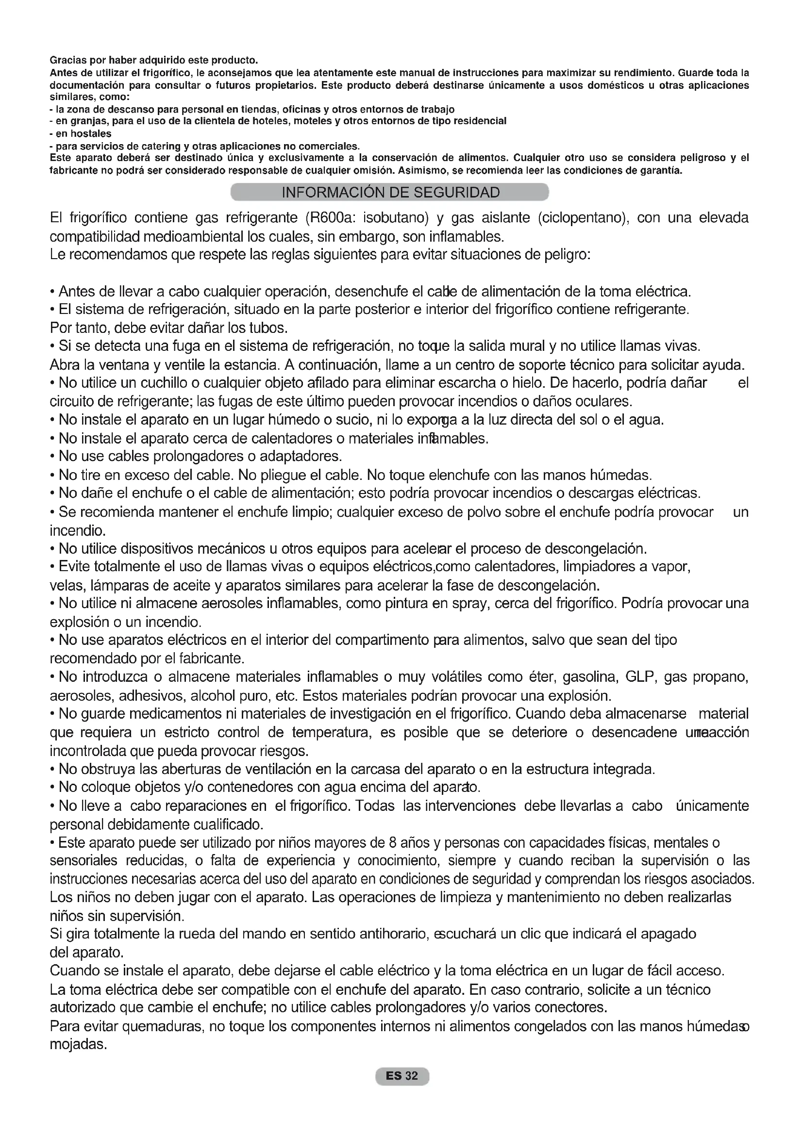 Gracias por haber adquirido este producto. Antes de utilizar el frigorífico, le aconsejamos que lea atentamente este manual de instrucciones para maximizar su rendimiento. Guarde toda la documentación para consultar o futuros propietarios. Este producto deberá destinarse únicamente a usos domésticos u otras aplicaciones similares, como: - la zona de descanso para personal en tiendas, oficinas y otros entornos de trabajo - en granjas, para el uso de la clientela de hoteles, moteles y otros entornos de tipo residencial - en hostales - para servicios de catering y otras aplicaciones no comerciales. Este aparato deberá ser destinado única y exclusivamente a la conservación de alimentos. Cualquier otro uso se considera peligroso y el fabricante no podrá ser considerado responsable de cualquier omisión. Asimismo, se recomienda leer las condiciones de garantía. El frigorífico contiene gas refrigerante (R600a: isobutano) y gas aislante (ciclopentano), con una elevada compatibilidad medioambiental los cuales, sin embargo, son inflamables. Le recomendamos que respete las reglas siguientes para evitar situaciones de peligro: