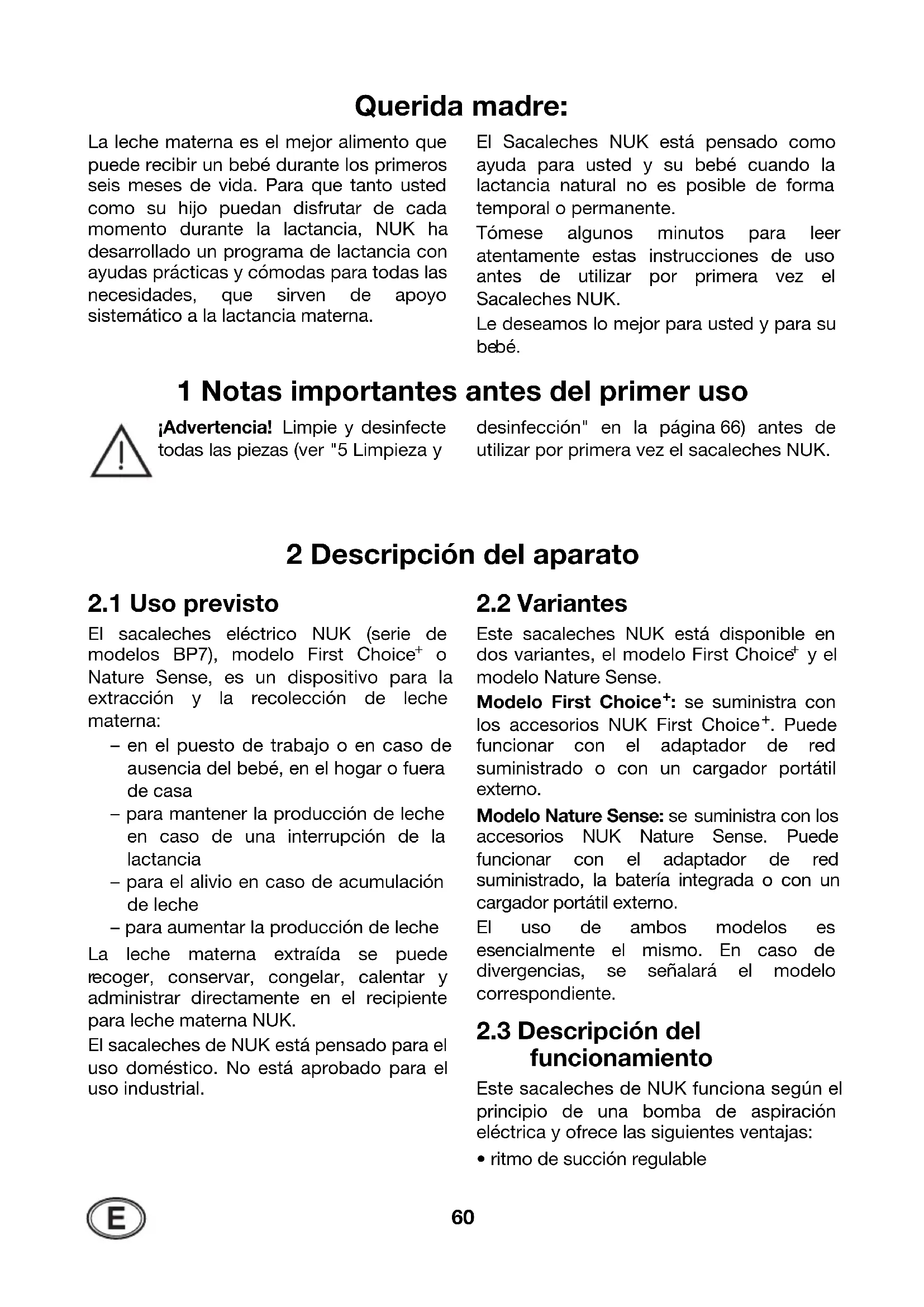 uda para usted y su bebé cuando la lactancia natural no es posible de forma temporal o permanente. Tómese algunos minutos para leer atentamente estas instrucciones de uso antes de utilizar por primera vez el Sacaleches NUK. Le deseamos lo mejor para usted y para su
