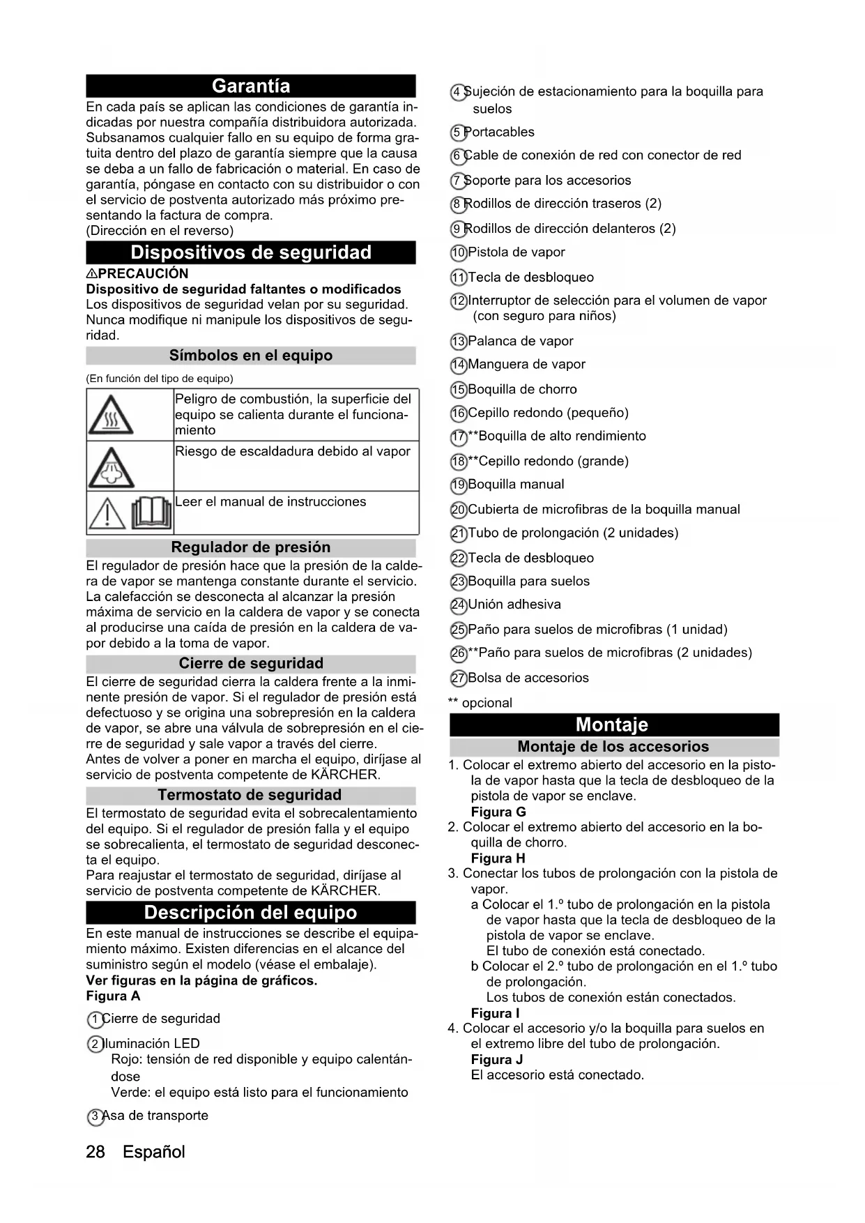 • Datos técnicos Español Garantía En cada país se aplican las condiciones de garantía in- dicadas por nuestra compañía distribuidora autorizada. Subsanamos cualquier fallo en su equipo de forma gra- tuita dentro del plazo de garantía siempre que la causa se deba a un fallo de fabricación o material. En caso de garantía, póngase en contacto con su distribuidor o con el servicio de postventa autorizado más próximo pre- sentando la factura de compra. (Dirección en el reverso) Dispositivos de seguridad 몇 PRECAUCIÓN Dispositivo de seguridad faltantes o modificados Los dispositivos de seguridad velan por su seguridad. Nunca modifique ni manipule los dispositivos de segu- ridad. Símbolos en el equipo (En función del tipo de equipo) Regulador de presión El regulador de presión hace que la presión de la calde- ra de vapor se mantenga constante durante el servicio. La calefacción se desconecta al alcanzar la presión máxima de servicio en la caldera de vapor y se conecta al producirse una caída de presión en la caldera de va- por debido a la toma de vapor. Cierre de seguridad El cierre de seguridad cierra la caldera frente a la inmi- nente presión de vapor. Si el regulador de presión está defectuoso y se origina una sobrepresión en la caldera de vapor, se abre una válvula de sobrepresión en el cie- rre de seguridad y sale vapor a través del cierre. Antes de volver a poner en marcha el equipo, diríjase al servicio de postventa competente de KÄRCHER. Termostato de seguridad El termostato de seguridad evita el sobrecalentamiento del equipo. Si el regulador de presión falla y el equipo se sobrecalienta, el termostato de seguridad desconec- ta el equipo. Para reajustar el termostato de seguridad, diríjase al servicio de postventa competente de KÄRCHER. Descripción del equipo En este manual de instrucciones se describe el equipa- miento máximo. Existen diferencias en el alcance del suministro según el modelo (véase el embalaje). Ver figuras en la página de gráficos. Figura A 1 Cierre de seguridad 2 Iluminación LED Rojo: tensión de red disponible y equipo calentán- dose Verde: el equipo está listo para el funcionamiento 3 Asa de transporte 4 Sujeción de estacionamiento para la boquilla para suelos 5 Portacables 6 Cable de conexión de red con conector de red 7 Soporte para los accesorios 8 Rodillos de dirección traseros (2) 9 Rodillos de dirección delanteros (2) 10 Pistola de vapor 11 Tecla de desbloqueo 12 Interruptor de selección para el volumen de vapor (con seguro para niños) 13 Palanca de vapor 14 Manguera de vapor 15 Boquilla de chorro 16 Cepillo redondo (pequeño) 17 **Boquilla de alto rendimiento 18 **Cepillo redondo (grande) 19 Boquilla manual 20 Cubierta de microfibras de la boquilla manual 21 Tubo de prolongación (2 unidades) 22 Tecla de desbloqueo 23 Boquilla para suelos 24 Unión adhesiva 25 Paño para suelos de microfibras (1 unidad) 26 **Paño para suelos de microfibras (2 unidades) 27 Bolsa de accesorios ** opcional Montaje Montaje de los accesorios p. 3128