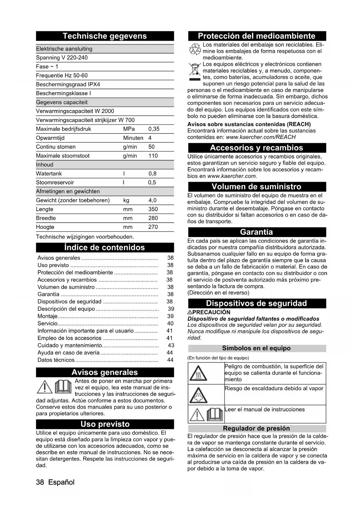 • vastklikt. Stoomhendel kan niet worden ingedrukt De stoomhendel is beveiligd door de kinderbeveiliging. Kinderbeveiliging (keuzeschakelaar voor stoom- hoeveelheid) naar voor zetten. Stoomhendel is ontgrendeld. Lange opwarmtijd Het stoomreservoir is verkalkt. Stoomreservoir ontkalken. Hoge waterafgifte Het stoomreservoir is verkalkt. Stoomreservoir ontkalken. Strijkijzer met stoomdruk "spuugt" water uit Stoomreservoir van de stoomreiniger uitspoelen of ontkalken, zie hoofdstuk Stoomreservoir ontkalken. Na strijkpauzes komen er waterdruppels uit het strijkijzer met stoomdruk Bij langere strijkpauzes kan stoom in de stoomleiding condenseren. Na strijkpauzes de stoomstoot op een doek richten tot de stoom gelijkmatig uittreedt. Waterhardheid °dH mmol/l TF I zacht 0-7 0-1,3 100 II medium 7-14 1,3-2,5 90 III hard 14-21 2,5-3,8 75 IV zeer hard >21 >3,8 5038 Español Technische gegevens Technische wijzigingen voorbehouden. Índice de contenidos Avisos generales Antes de poner en marcha por primera vez el equipo, lea este manual de ins- trucciones y las instrucciones de seguri- dad adjuntas. Actúe conforme a estos documentos. Conserve estos dos manuales para su uso posterior o para propietarios ulteriores. Uso previsto Utilice el equipo únicamente para uso doméstico. El equipo está diseñado para la limpieza con vapor y pue- de utilizarse con los accesorios adecuados, como se describe en este manual de instrucciones. No se nece- sitan detergentes. Respete las instrucciones de seguri- dad. Protección del medioambiente Los materiales del embalaje son reciclables. Eli- mine los embalajes de forma respetuosa con el medioambiente. Los equipos eléctricos y electrónicos contienen materiales reciclables y, a menudo, componen- tes, como baterías, acumuladores o aceite, que suponen un riesgo potencial para la salud de las personas o el medioambiente en caso de manipularse o eliminarse de forma inadecuada. Sin embargo, dichos componentes son necesarios para un servicio adecua- do del equipo. Los equipos identificados con este sím- bolo no pueden eliminarse con la basura doméstica. Avisos sobre sustancias contenidas (REACH) Encontrará información actual sobre las sustancias contenidas en: www.kaercher.com/REACH Accesorios y recambios Utilice únicamente accesorios y recambios originales, estos garantizan un servicio seguro y fiable del equipo. Encontrará información sobre los accesorios y recam- bios en www.kaercher.com. Volumen de suministro El volumen de suministro del equipo de muestra en el embalaje. Compruebe la integridad del volumen de su- ministro durante el desembalaje. Póngase en contacto con su distribuidor si faltan accesorios o en caso de da- ños de transporte. Garantía En cada país se aplican las condiciones de garantía in- dicadas por nuestra compañía distribuidora autorizada. Subsanamos cualquier fallo en su equipo de forma gra- tuita dentro del plazo de garantía siempre que la causa se deba a un fallo de fabricación o material. En caso de garantía, póngase en contacto con su distribuidor o con el servicio de postventa autorizado más próximo pre- sentando la factura de compra. (Dirección en el reverso) Dispositivos de seguridad 몇 PRECAUCIÓN Dispositivo de seguridad faltantes o modificados Los dispositivos de seguridad velan por su seguridad. Nunca modifique ni manipule los dispositivos de segu- ridad. Símbolos en el equipo (En función del tipo de equipo) Regulador de presión El regulador de presión hace que la presión de la calde- ra de vapor se mantenga constante durante el servicio. La calefacción se desconecta al alcanzar la presión máxima de servicio en la caldera de vapor y se conecta al producirse una caída de presión en la caldera de va- por debido a la toma de vapor. Elektrische aansluiting Spanning V 220-240 Fase ~ 1 Frequentie Hz 50-60 Beschermingsgraad IPX4 Beschermingsklasse I Gegevens capaciteit Verwarmingscapaciteit W 2000 Verwarmingscapaciteit strijkijzer W 700 Maximale bedrijfsdruk MPa 0,35 Opwarmtijd Minuten 4 Continu stomen g/min 50 Maximale stoomstoot g/min 110 Inhoud Watertank l 0,8 Stoomreservoir l 0,5 Afmetingen en gewichten Gewicht (zonder toebehoren) kg 4,0 Lengte mm 350 Breedte mm 280 Hoogte mm 270 Avisos generales p. 38