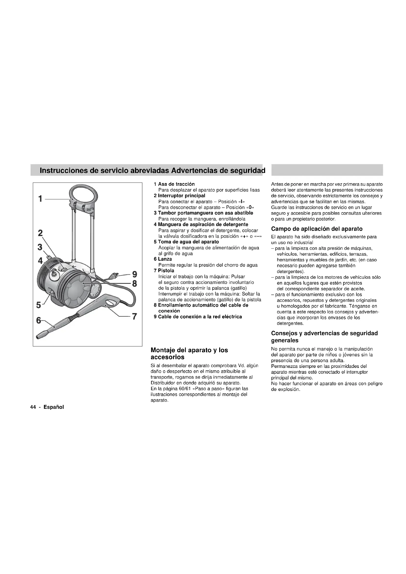 (2000/14/EG) 93 dB(A) Afmetingen Lengte/breedte/hoogte 500/410/925 mm Gewicht 21 kg44 - Español 1 Asa de tracción Para desplazar el aparato por superficies lisas 2 Interruptor principal Para conectar el aparato – Posición «I» Para desconectar el aparato – Posición «0» 3 Tambor portamanguera con asa abatible Para recoger la manguera, enrollándola 4 Manguera de aspiración de detergente Para aspirar y dosificar el detergente, colocar la válvula dosificadora en la posición «+» o «–» 5 Toma de agua del aparato Acoplar la manguera de alimentación de agua al grifo de agua 6 Lanza Permite regular la presión del chorro de agua 7 Pistola Iniciar el trabajo con la máquina: Pulsar el seguro contra accionamiento involuntario de la pistola y oprimir la palanca (gatillo) Interrumpir el trabajo con la máquina: Soltar la palanca de accionamiento (gatillo) de la pistola 8 Enrollamiento automático del cable de conexión 9 Cable de conexión a la red eléctrica Montaje del aparato y los accesorios Si al desembalar el aparato comprobara Vd. algún daño o desperfecto en el mismo atribuible al transporte, rogamos se dirija inmediatamente al Distribuidor en donde adquirió su aparato. En la página 60/61 «Paso a paso» figuran las ilustraciones correspondientes al montaje del aparato. Instrucciones de servicio abreviadas Advertencias de seguridad Antes de poner en marcha por vez primera su aparato deberá leer atentamente las presentes instrucciones de servicio, observando estrictamente los consejos y advertencias que se facilitan en las mismas. Guarde las instrucciones de servicio en un lugar seguro y accesible para posibles consultas ulteriores o para un propietario posterior. Campo de aplicación del aparato El aparato ha sido diseñado exclusivamente para un uso no industrial – para la limpieza con alta presión de máquinas, vehículos, herramientas, edificios, terrazas, herramientas y muebles de jardín, etc. (en caso necesario pueden agregarse también detergentes). – para la limpieza de los motores de vehículos sólo en aquellos lugares que estén provistos del correspondiente separador de aceite. – para el funcionamiento exclusivo con los accesorios, repuestos y detergentes originales u homologados por el fabricante. Ténganse en cuenta a este respecto los consejos y adverten- cias que incorporan los envases de los detergentes. Consejos y advertencias de seguridad generales No permita nunca el manejo o la manipulación del aparato por parte de niños o jóvenes sin la presencia de una persona adulta. Permanezca siempre en las proximidades del aparato mientras esté conectado el interruptor principal del mismo. No hacer funcionar el aparato en áreas con peligro de explosión.Español - 45