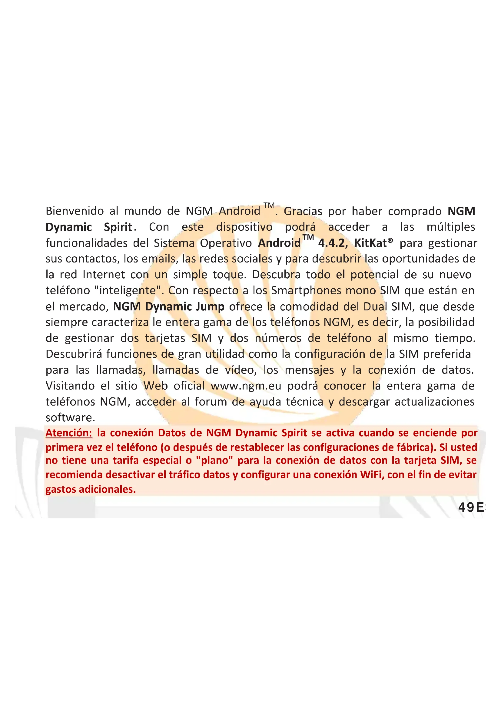 . Gracias por haber comprado NGM Dynamic Spirit . Con este dispositivo podrá acceder a las múltiples funcionalidades del Sistema Operativo Android
