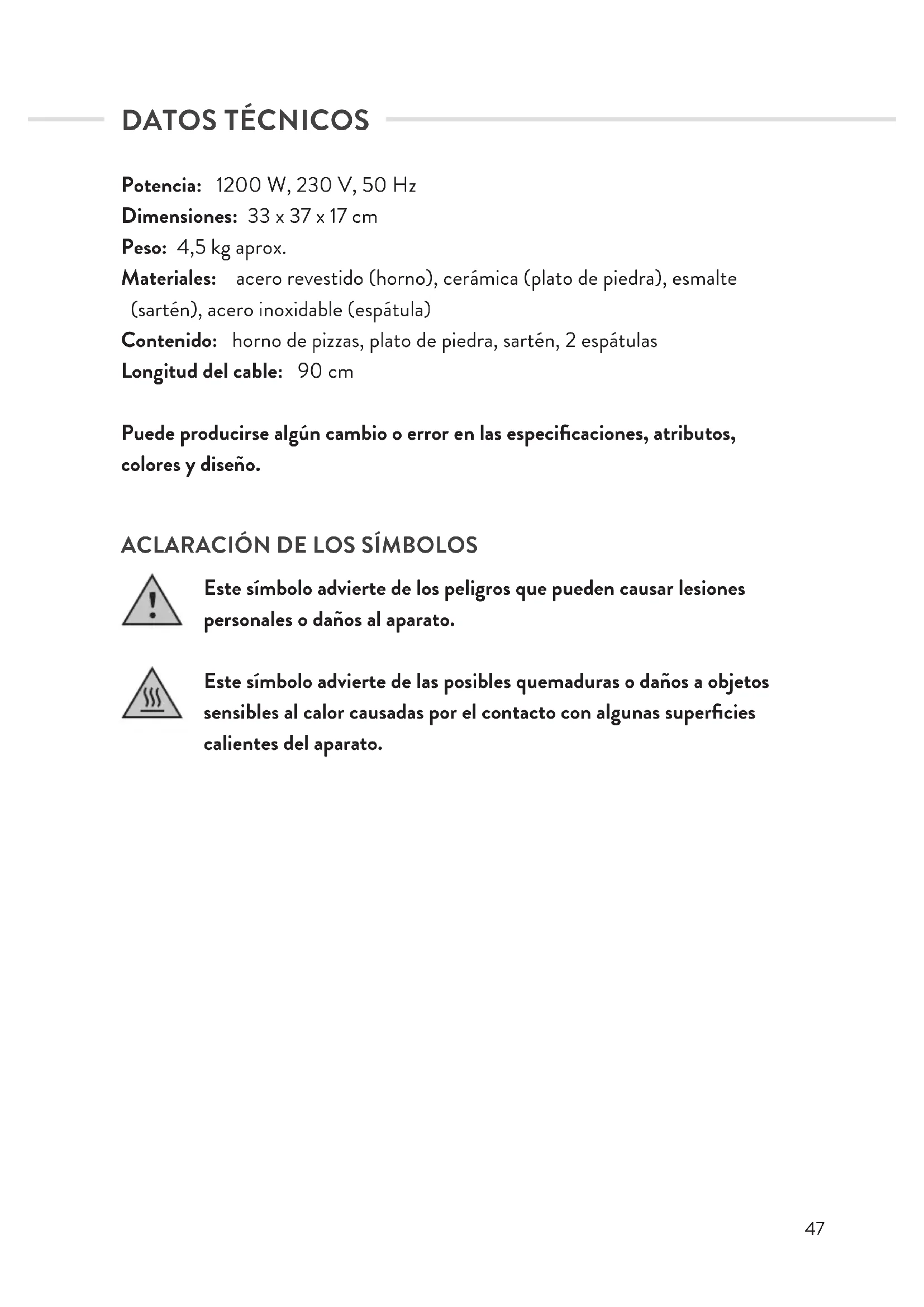 No dejes nunca el horno en funcionamiento y sin vigilancia, especialmente cuando haya dentro productos para hornear. Los componentes del horno para pizzas como el plato de piedra, las resistencias o la carcasa se calientan mucho durante su funcionamiento. Utilice guantes térmicos y utensilios de cocina adecuados. Deje que se enfríe por completo antes de limpiarlo o moverlo.
