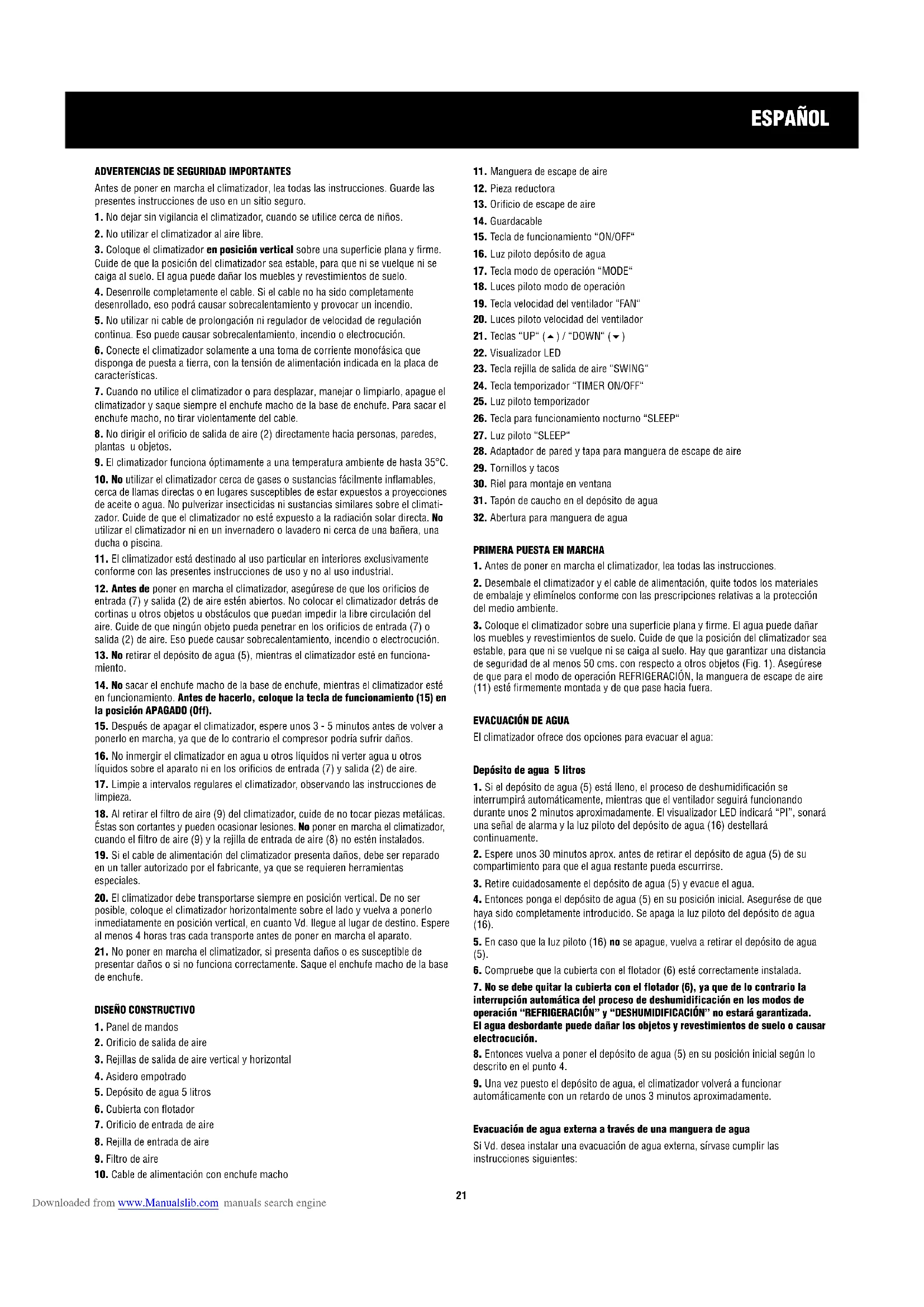 automáticamente con un retardo de unos 3 minutos aproximadamente. Evacuación de agua externa a través de una manguera de agua Si Vd. desea instalar una evacuación de agua externa, sírvase cumplir las instrucciones siguientes: Downloaded from www.Manualslib.com manuals search engineESPAÑOL