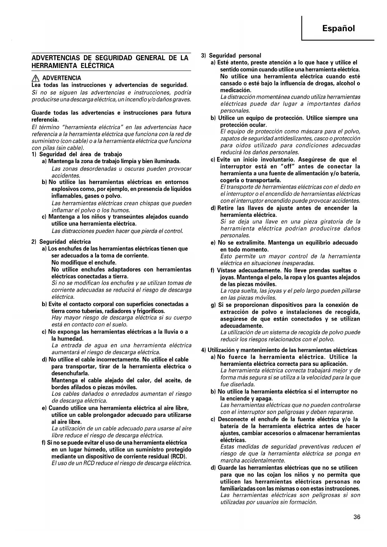 a) No fuerce la herramienta eléctrica. Utilice la herramienta eléctrica correcta para su aplicación. La herramienta eléctrica correcta trabajará mejor y de forma más segura si se utiliza a la velocidad para la que fue diseñada. b) No utilice la herramienta eléctrica si el interruptor no la enciende y apaga. Las herramientas eléctricas que no pueden controlarse con el interruptor son peligrosas y deben repararse. c) Desconecte el enchufe de la fuente eléctrica y/o la batería de la herramienta eléctrica antes de hacer ajustes, cambiar accesorios o almacenar herramientas eléctricas. Estas medidas de seguridad preventivas reducen el riesgo de que la herramienta eléctrica se ponga en marcha accidentalmente. d) Guarde las herramientas eléctricas que no se utilicen para que no las cojan los niños y no permita que utilicen las herramientas eléctricas personas no familiarizadas con las mismas o con estas instrucciones. Las herramientas eléctricas son peligrosas si son utilizadas por usuarios sin formación. 06Spa_C9U2_WE 11/19/08, 16:403637 Español e) Mantenimiento de las herramientas eléctricas. Compruebe si las piezas móviles están mal alineadas o unidas, si hay alguna pieza rota u otra condición que pudiera afectar al funcionamiento de las herramientas eléctricas. Si la herramienta eléctrica está dañada, llévela a reparar antes de utilizarla. Se producen muchos accidentes por no realizar un mantenimiento correcto de las herramientas eléctricas. f) Mantenga las herramientas de corte afiladas y limpias. Las herramientas de corte correctamente mantenidas con los bordes de corte afilados son más fáciles de controlar. g) Utilice la herramienta eléctrica, los accesorios y las brocas de la herramienta, etc. de acuerdo con estas instrucciones, teniendo en cuenta las condiciones laborales y el trabajo que se va a realizar. La utilización de la herramienta eléctrica para operaciones diferentes a aquellas pretendidas podría dar lugar a una situación peligrosa.
