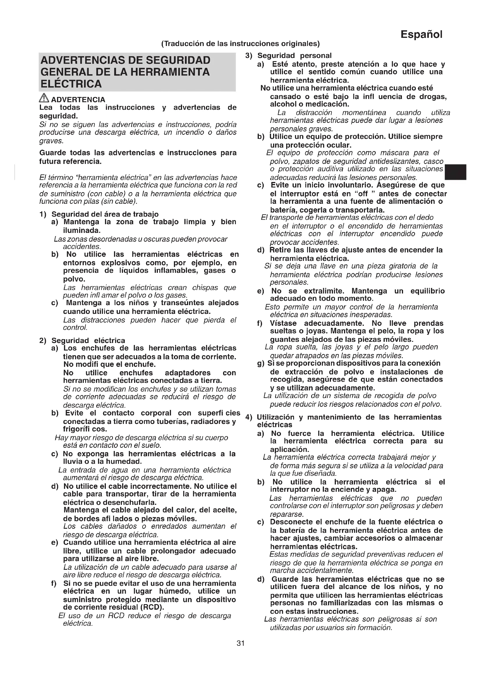a) Los enchufes de las herramientas eléctricas tienen que ser adecuados a la toma de corriente. No modifi que el enchufe. No utilice enchufes adaptadores con herramientas eléctricas conectadas a tierra. Si no se modifi can los enchufes y se utilizan tomas de corriente adecuadas se reducirá el riesgo de descarga eléctrica. b) Evite el contacto corporal con superfi cies conectadas a tierra como tuberías, radiadores y frigorífi cos. Hay mayor riesgo de descarga eléctrica si su cuerpo está en contacto con el suelo. c) No exponga las herramientas eléctricas a la lluvia o a la humedad. La entrada de agua en una herramienta eléctrica aumentará el riesgo de descarga eléctrica. d) No utilice el cable incorrectamente. No utilice el cable para transportar, tirar de la herramienta eléctrica o desenchufarla. Mantenga el cable alejado del calor, del aceite, de bordes afi lados o piezas móviles. Los cables dañados o enredados aumentan el riesgo de descarga eléctrica. e) Cuando utilice una herramienta eléctrica al aire libre, utilice un cable prolongador adecuado para utilizarse al aire libre. La utilización de un cable adecuado para usarse al aire libre reduce el riesgo de descarga eléctrica. f) Si no se puede evitar el uso de una herramienta eléctrica en un lugar húmedo, utilice un suministro protegido mediante un dispositivo de corriente residual (RCD). El uso de un RCD reduce el riesgo de descarga eléctrica. (Traducción de las instrucciones originales) 0000BookG10SD2.indb310000BookG10SD2.indb31 2014/10/319:11:482014/10/319:11:4832 Español e) Realice el mantenimiento de las herramientas eléctricas. Compruebe si las piezas móviles están mal alineadas o unidas, si hay alguna pieza rota u otra condición que pudiera afectar al funcionamiento de las herramientas eléctricas. Si la herramienta eléctrica está dañada, llévela a reparar antes de utilizarla. Se producen muchos accidentes por no realizar un mantenimiento correcto de las herramientas eléctricas. f) Mantenga las herramientas de corte afi ladas y limpias. Las herramientas de corte correctamente mantenidas con los bordes de corte afi lados son más fáciles de controlar, y existe menor riesgo de que se atasquen. g) Utilice la herramienta eléctrica, los accesorios y las brocas de la herramienta, etc. de acuerdo con estas instrucciones, teniendo en cuenta las condiciones laborales y el trabajo que se va a realizar. La utilización de la herramienta eléctrica para operaciones diferentes a las previstas podría dar lugar a una situación peligrosa.