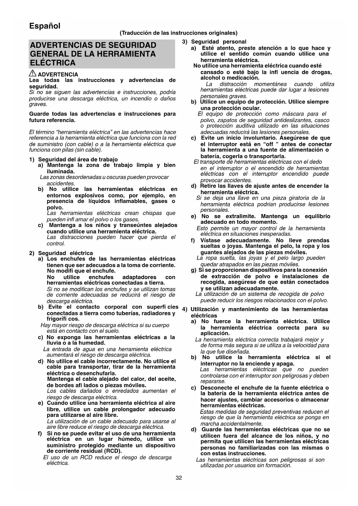 a) Los enchufes de las herramientas eléctricas tienen que ser adecuados a la toma de corriente. No modifi que el enchufe. No utilice enchufes adaptadores con herramientas eléctricas conectadas a tierra. Si no se modifi can los enchufes y se utilizan tomas de corriente adecuadas se reducirá el riesgo de descarga eléctrica. b) Evite el contacto corporal con superfi cies conectadas a tierra como tuberías, radiadores y frigorífi cos. Hay mayor riesgo de descarga eléctrica si su cuerpo está en contacto con el suelo. c) No exponga las herramientas eléctricas a la lluvia o a la humedad. La entrada de agua en una herramienta eléctrica aumentará el riesgo de descarga eléctrica. d) No utilice el cable incorrectamente. No utilice el cable para transportar, tirar de la herramienta eléctrica o desenchufarla. Mantenga el cable alejado del calor, del aceite, de bordes afi lados o piezas móviles. Los cables dañados o enredados aumentan el riesgo de descarga eléctrica. e) Cuando utilice una herramienta eléctrica al aire libre, utilice un cable prolongador adecuado para utilizarse al aire libre. La utilización de un cable adecuado para usarse al aire libre reduce el riesgo de descarga eléctrica. f) Si no se puede evitar el uso de una herramienta eléctrica en un lugar húmedo, utilice un suministro protegido mediante un dispositivo de corriente residual (RCD). El uso de un RCD reduce el riesgo de descarga eléctrica. (Traducción de las instrucciones originales) 0000BookG18UC.indb320000BookG18UC.indb32 2016/07/2510:26:282016/07/2510:26:2833 Español e) Realice el mantenimiento de las herramientas eléctricas. Compruebe si las piezas móviles están mal alineadas o unidas, si hay alguna pieza rota u otra condición que pudiera afectar al funcionamiento de las herramientas eléctricas. Si la herramienta eléctrica está dañada, llévela a reparar antes de utilizarla. Se producen muchos accidentes por no realizar un mantenimiento correcto de las herramientas eléctricas. f) Mantenga las herramientas de corte afi ladas y limpias. Las herramientas de corte correctamente mantenidas con los bordes de corte afi lados son más fáciles de controlar, y existe menor riesgo de que se atasquen. g) Utilice la herramienta eléctrica, los accesorios y las brocas de la herramienta, etc. de acuerdo con estas instrucciones, teniendo en cuenta las condiciones laborales y el trabajo que se va a realizar. La utilización de la herramienta eléctrica para operaciones diferentes a las previstas podría dar lugar a una situación peligrosa.