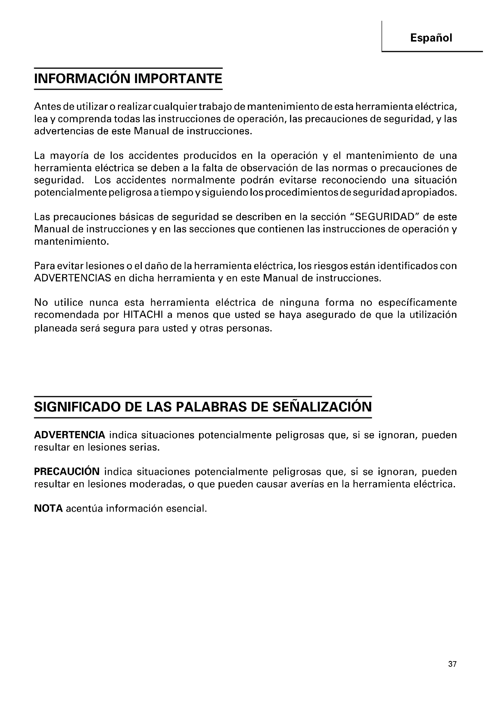 Antes de utilizar o realizar cualquier trabajo de mantenimiento de esta herramienta eléctrica, lea y comprenda todas las instrucciones de operación, las precauciones de seguridad, y las advertencias de este Manual de instrucciones. La mayoría de los accidentes producidos en la operación y el mantenimiento de una herramienta eléctrica se deben a la falta de observación de las normas o precauciones de seguridad. Los accidentes normalmente podrán evitarse reconociendo una situación potencialmente peligrosa a tiempo y siguiendo los procedimientos de seguridad apropiados. Las precauciones básicas de seguridad se describen en la sección “SEGURIDAD” de este Manual de instrucciones y en las secciones que contienen las instrucciones de operación y mantenimiento. Para evitar lesiones o el daño de la herramienta eléctrica, los riesgos están identificados con ADVERTENCIAS en dicha herramienta y en este Manual de instrucciones. No utilice nunca esta herramienta eléctrica de ninguna forma no específicamente recomendada por HITACHI a menos que usted se haya asegurado de que la utilización planeada será segura para usted y otras personas. SIGNIFICADO DE LAS PALABRAS DE SEÑALIZACIÓN ADVERTENCIA indica situaciones potencialmente peligrosas que, si se ignoran, pueden resultar en lesiones serias. PRECAUCIÓN indica situaciones potencialmente peligrosas que, si se ignoran, pueden resultar en lesiones moderadas, o que pueden causar averías en la herramienta eléctrica. NOTA acentúa información esencial.38 Español SEGURIDAD