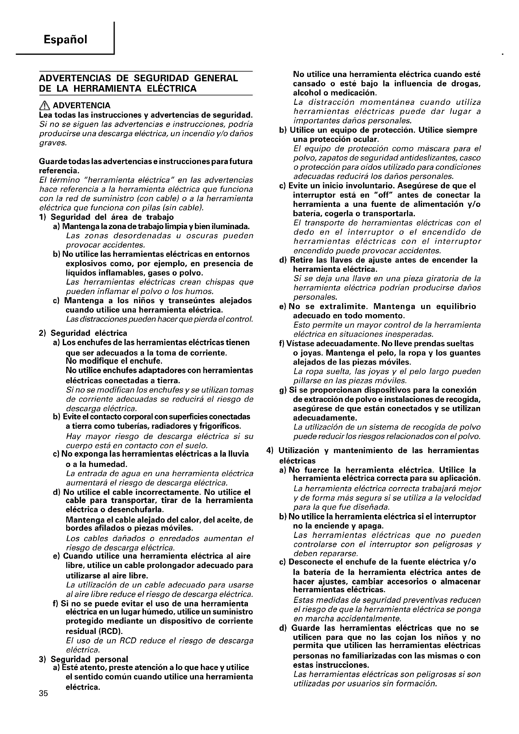 eléctricas a) No fuerce la herramienta eléctrica. Utilice la herramienta eléctrica correcta para su aplicación. La herramienta eléctrica correcta trabajará mejor y de forma más segura si se utiliza a la velocidad para la que fue diseñada. b) No utilice la herramienta eléctrica si el interruptor no la enciende y apaga. Las herramientas eléctricas que no pueden controlarse con el interruptor son peligrosas y deben repararse. c) Desconecte el enchufe de la fuente eléctrica y/o la batería de la herramienta eléctrica antes de hacer ajustes, cambiar accesorios o almacenar herramientas eléctricas. Estas medidas de seguridad preventivas reducen el riesgo de que la herramienta eléctrica se ponga en marcha accidentalmente. d) Guarde las herramientas eléctricas que no se utilicen para que no las cojan los niños y no permita que utilicen las herramientas eléctricas personas no familiarizadas con las mismas o con estas instrucciones. Las herramientas eléctricas son peligrosas si son utilizadas por usuarios sin formación. 06Spa_G13SBL_WE 12/2/09, 9:04 AM3536 Español e) Mantenimiento de las herramientas eléctricas. Compruebe si las piezas móviles están mal alineadas o unidas, si hay alguna pieza rota u otra condición que pudiera afectar al funcionamiento de las herramientas eléctricas. Si la herramienta eléctrica está dañada, llévela a reparar antes de utilizarla. Se producen muchos accidentes por no realizar un mantenimiento correcto de las herramientas eléctricas. f) Mantenga las herramientas de corte afiladas y limpias. Las herramientas de corte correctamente mantenidas con los bordes de corte afilados son más fáciles de controlar. g) Utilice la herramienta eléctrica, los accesorios y las brocas de la herramienta, etc. de acuerdo con estas instrucciones, teniendo en cuenta las condiciones laborales y el trabajo que se va a realizar. La utilización de la herramienta eléctrica para operaciones diferentes a aquellas pretendidas podría dar lugar a una situación peligrosa.