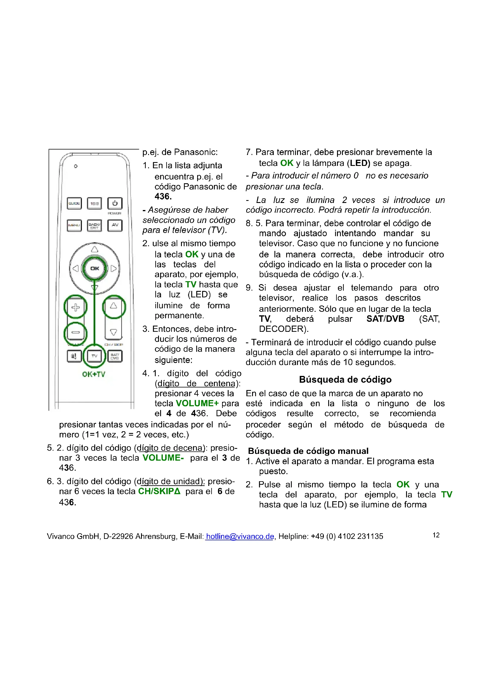 tecla del aparato, por ejemplo, la tecla TV hasta que la luz (LED) se ilumine de forma Vivanco GmbH, D-22926 Ahrensburg, E-Mail: hotline@vivanco.de, Helpline: +49 (0) 4102 231135 12permanente.
