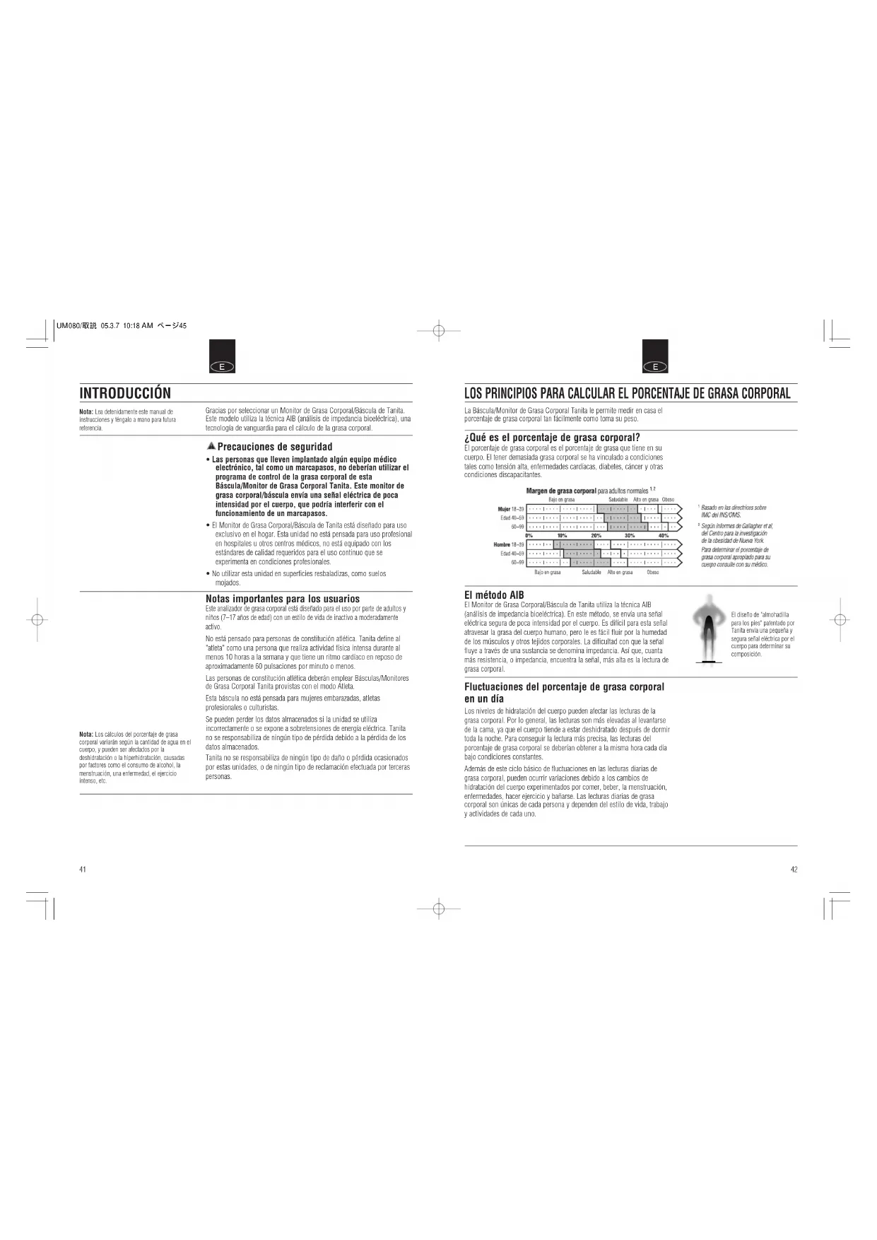 INTRODUCCIÓN Gracias por seleccionar un Monitor de Grasa Corporal/Báscula de Tanita. Este modelo utiliza la técnica AIB (análisis de impedancia bioeléctrica), una tecnología de vanguardia para el cálculo de la grasa corporal. Precauciones de seguridad