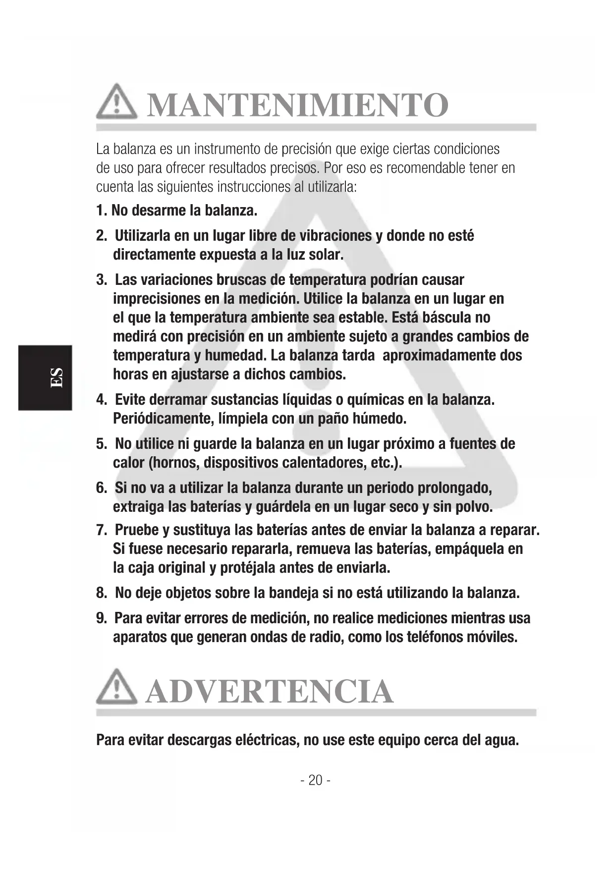 MANTENIMIENTO La balanza es un instrumento de precisión que exige ciertas condiciones de uso para ofrecer resultados precisos. Por eso es recomendable tener en cuenta las siguientes instrucciones al utilizarla: