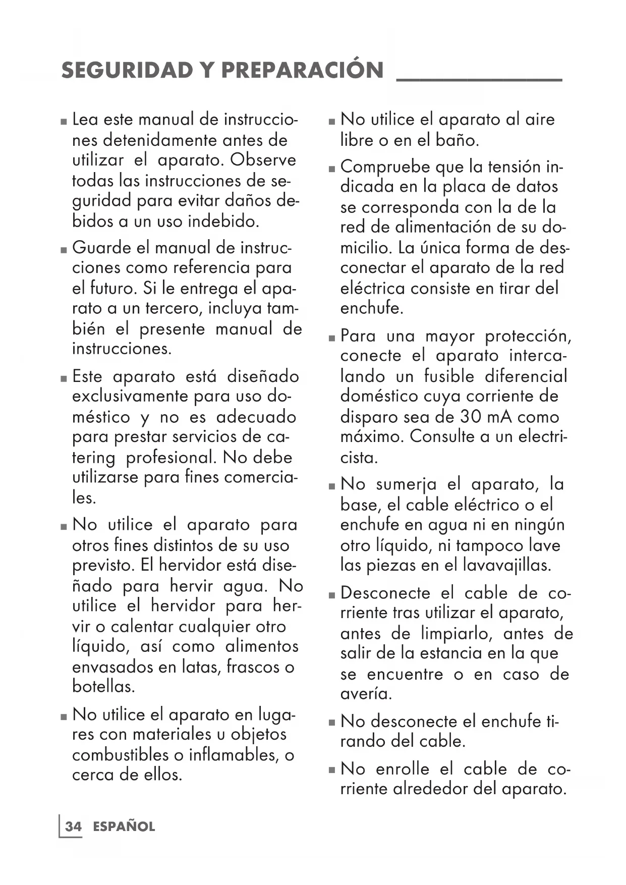 No utilice el aparato para otros fines distintos de su uso previsto. El hervidor está dise- ñado para hervir agua. No utilice el hervidor para her- vir o calentar cualquier otro líquido, así como alimentos envasados en latas, frascos o botellas.