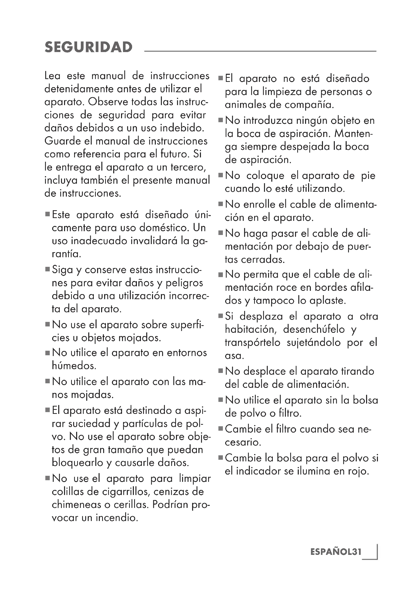 SEGURIDAD Lea este manual de instrucciones detenidamente antes de utilizar el aparato. Observe todas las instruc- ciones de seguridad para evitar daños debidos a un uso indebido. Guarde el manual de instrucciones como referencia para el futuro. Si le entrega el aparato a un tercero, incluya también el presente manual de instrucciones.