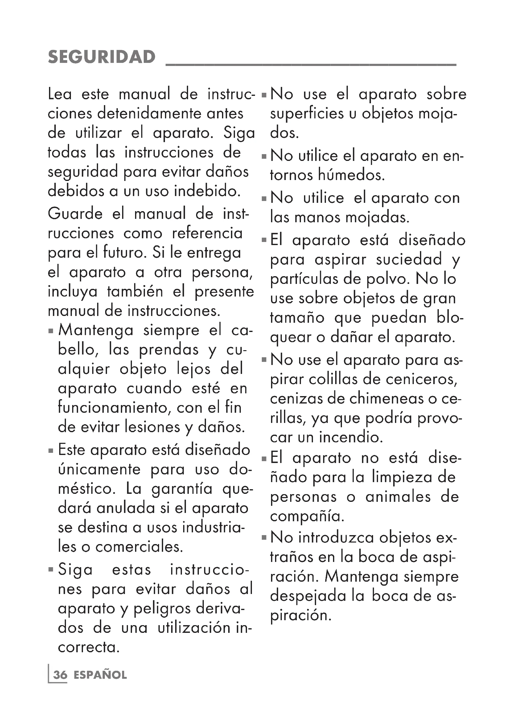 SEGURIDAD ______________________________ Lea este manual de instruc- ciones detenidamente antes de utilizar el aparato. Siga todas las instrucciones de seguridad para evitar daños debidos a un uso indebido. Guarde el manual de inst- rucciones como referencia para el futuro. Si le entrega el aparato a otra persona, incluya también el presente manual de instrucciones.