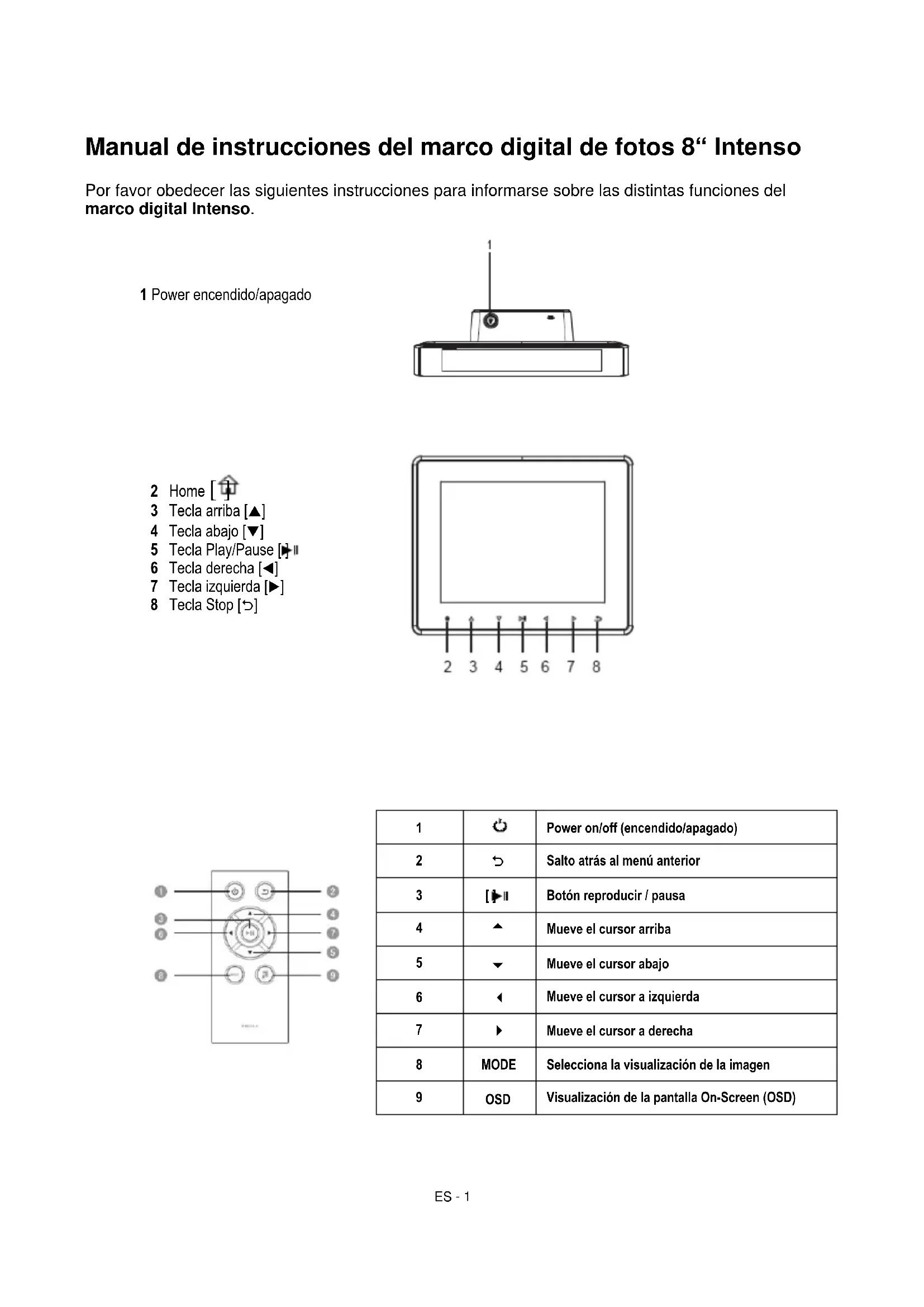 ¡Le deseamos que disfrute de su marco digital Intenso!ES - 8 Cuidado y Mantenimiento Cuidado Para evitar el riesgo de descarga eléctrica no retire ni los tornillos ni la carcasa. No utilice este aparato cerca del agua. No ponga en contacto al aparato ni con l luvia ni con humedad. No coloque cerca del aparato ningún objeto que almacene agua o cualquier otro tipo de líquido. No instale este marco de fotos cerca de calefacciones, hornos o cualquier otro aparato que desprenda calor. No abra la carcasa. No intente reparar el aparato usted mismo. Déjelo en manos de personal cualificado. Evite su uso en lugares arenosos. Introduzca completamente el enchufe de conexión de la fuente de alimentación en la abertura del MD prevista. Solo de esta forma se puede evitar la carga electroestática. Conecte de manera correcta y segura todas las conexiones. No presione el display. Proteja al display de la radiación solar directa. El marco de fotos reproduce solo formatos de archivo compatibles. Las imágenes pueden estar protegidas por derecho a terceros. La reproducción sin licencia puede violar los derechos de copyright. No ponga en contacto el MD con objetos metálicos mientras se encuentra operativo. Evite su uso sobre cojines, sofás u otros objetos de salón que favorezcan el desarrollo de calor, puesto que existe riesgo de sobrecalentamiento. No retire la tarjeta de memoria mientras se está produciendo su lectura. De otro modo podría producirse la caída del sistema o la pérdida de datos. No apague el aparato mientras se está llevando a cabo la presentación. No empaquete el aparato justo después de un uso prolongado. Asegúrese de que se enfríe lo suficiente. En caso contrario existe el riesgo de sobrecalentamiento. Para garantizar un mejor servicio pueden producirse cambios en el manual de instrucciones.