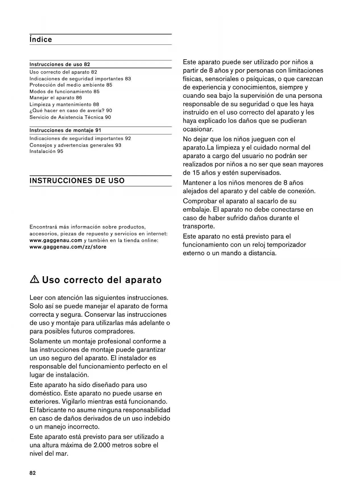 PP82 Índice [es]Instrucciones de uso y montaje Instrucciones de uso 82 Uso correcto del aparato 82 Indicaciones de seguridad importantes 83 Protección del medio ambiente 85 Modos de funcionamiento 85 Manejar el aparato 86 Limpieza y mantenimiento 88 ¿Qué hacer en caso de avería? 90 Servicio de Asistencia Técnica 90 Instrucciones de montaje 91 Indicaciones de seguridad importantes 92 Consejos y advertencias generales 93 Instalación 95
