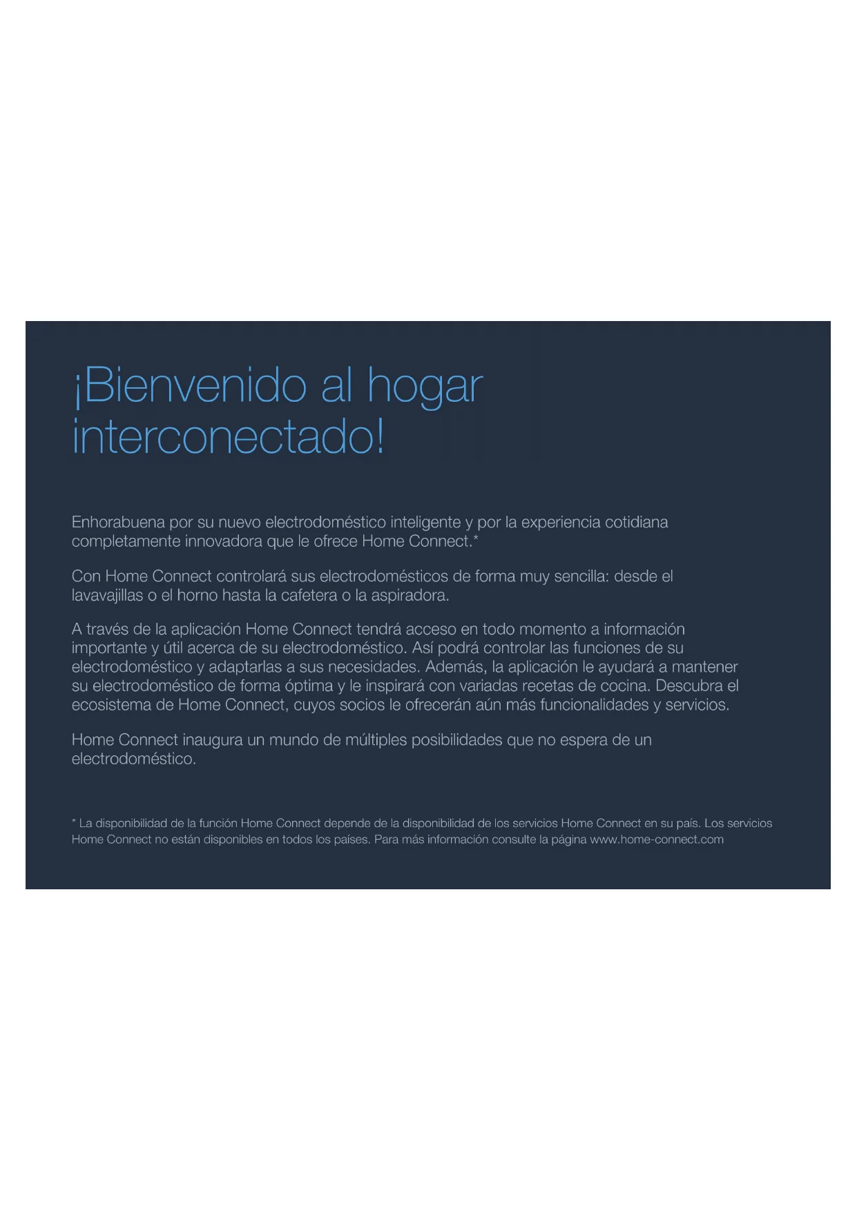 2 | Follow the instructions in the app. stops ashing on the display's control panel. The login process is now complete. Information: If the connection could not be established make sure your smartphone/tablet is within range of your Wi-Fi network.14 DE Enhorabuena por su nuevo electrodoméstico inteligente y por la experiencia cotidiana completamente innovadora que le ofrece HomeConnect.* Con HomeConnect controlará sus electrodomésticos de forma muy sencilla: desde el lavavajillas o el horno hasta la cafetera o la aspiradora. A través de la aplicación HomeConnect tendrá acceso en todo momento a información importante y útil acerca de su electrodoméstico. Así podrá controlar las funciones de su electrodoméstico y adaptarlas a sus necesidades. Además, la aplicación le ayudará a mantener su electrodoméstico de forma óptima y le inspirará con variadas recetas de cocina. Descubra el ecosistema de HomeConnect, cuyos socios le ofrecerán aún más funcionalidades y servicios. HomeConnect inaugura un mundo de múltiples posibilidades que no espera de un electrodoméstico. *La disponibilidad de la función HomeConnect depende de la disponibilidad de los servicios HomeConnect en su país. Los servicios HomeConnect no están disponibles en todos los países. Para más información consulte la página www.home-connect.com ¡Bienvenido al hogar interconectado!15 ES Descubra las posibilidades de HomeConnect Gestione su electrodoméstico En la vista general de electrodomésticos de la aplicación encontrará todos los electrodomésticos conectados y tendrá acceso a información importante y útil. Así, por ejemplo, podrá controlar las funciones de su electrodoméstico y adaptarlas a sus necesidades. Déjese inspirar El área de recetas ofrece una gran variedad de recetas inspiradoras, consejos y vídeos que harán su experiencia en la cocina aún más agradable. Ayuda y asistencia El área de servicios le ofrece información muy útil sobre el correcto mantenimiento y manejo de su electrodoméstico. Aún más ventajas Nuestra red de socios está en continuo crecimiento. Puede encontrar una vista general de todos los socios en www.home-connect.com. ¡Vamos a empezar! ¿Qué necesita? 1 | Su campana extractora, conectada a la corriente. 2 | Un teléfono inteligente o una tableta con una versión actual del sistema operativo iOS o Android. 3 | La campana extractora debe encontrarse dentro del margen de alcance de la señalWi-Fi de su red doméstica. 4 | El nombre (SSID) y la contraseña (clave) de su redWi-Fi. 5 | Estas instrucciones de instalación. Información importante: Seguridad de datos: la seguridad de los datos tiene absoluta prioridad para HomeConnect. El intercambio de datos se efectúa siempre de manera cifrada. HomeConnect implementa medidas de seguridad que se comprueban y actualizan periódicamente. Más información al respecto en www.home-connect.com. Seguridad del electrodoméstico: Para un funcionamiento seguro de su aparato con la función HomeConnect, preste atención a las advertencias de seguridad indicadas en las instrucciones de uso del mismo.16 ES Paso2: Conectar la campana extractora a la red doméstica 1 | La campana extractora ya está conectada a la red eléctrica. 2 | Abrir la aplicación HomeConnect para añadir la campana extractora. 3 | Seguir las indicaciones de la aplicación y guiarse solo por estas instrucciones cuando la aplicación así lo requiera. Nota: Trabajamos constantemente en la mejora de la aplicación HomeConnect. Esto puede originar diferencias en los pasos para realizar la conexión. Cíñase a las indicaciones de la última versión de su aplicación HomeConnect. Esta le guiará a lo largo del proceso de conexión. Paso1: Descargar la aplicación HomeConnect y crear una cuenta de usuario 1 | Abrir en el teléfono inteligente o la tableta AppStore (dispositivos Apple) o Google Play Store (dispositivosAndroid). 2 | Buscar en la tienda la aplicación «HomeConnect» e instalarla. Aplicación HomeConnect: 3 | Abrir la aplicación y registrarse para crear una cuenta de usuario de HomeConnect. 4 | Anotar los datos de acceso de HomeConnect (cuenta de usuario y contraseña), estos datos se necesitarán más tarde. La aplicación le guiará mientras realiza los pasos necesarios para conectar su aparato con HomeConnect. La aplicación se remite a estas instrucciones cuando es necesario.17 ES Paso2.1: Conectar la campana extractora a la red doméstica con WPS Seguir las instrucciones del paso2.1 solo cuando la aplicación así lo requiera. Los siguientes pasos describen acciones que deben realizarse en el propio aparato. Nota: Para conectar la campana extractora con la red doméstica, la campana y la luz deben estar apagadas. Se puede interrumpir el proceso en cualquier momento pulsando la tecla