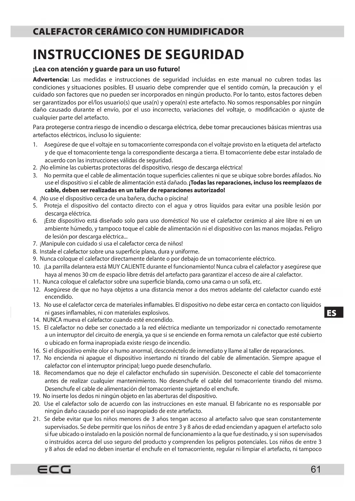 - Use el calefactor solo de acuerdo con las instrucciones en este manual. El fabricante no es responsable por ningún daño causado por el uso inapropiado de este artefacto.
