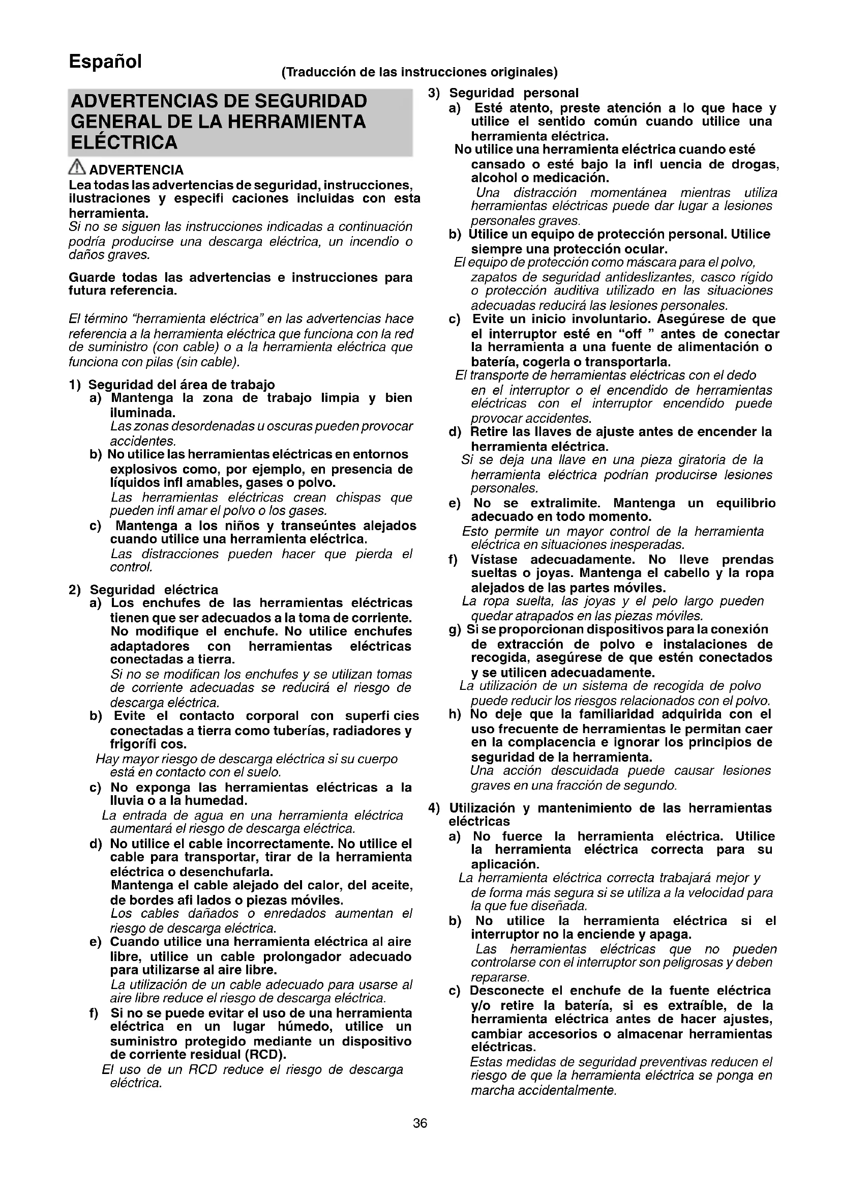 a) Los enchufes de las herramientas eléctricas tienen que ser adecuados a la toma de corriente. No modifi que el enchufe. No utilice enchufes adaptadores con herramientas eléctricas conectadas a tierra. Si no se modifi can los enchufes y se utilizan tomas de corriente adecuadas se reducirá el riesgo de descarga eléctrica. b) Evite el contacto corporal con superfi cies conectadas a tierra como tuberías, radiadores y frigorífi cos. Hay mayor riesgo de descarga eléctrica si su cuerpo está en contacto con el suelo. c) No exponga las herramientas eléctricas a la lluvia o a la humedad. La entrada de agua en una herramienta eléctrica aumentará el riesgo de descarga eléctrica. d) No utilice el cable incorrectamente. No utilice el cable para transportar, tirar de la herramienta eléctrica o desenchufarla. Mantenga el cable alejado del calor, del aceite, de bordes afi lados o piezas móviles. Los cables dañados o enredados aumentan el riesgo de descarga eléctrica. e) Cuando utilice una herramienta eléctrica al aire libre, utilice un cable prolongador adecuado para utilizarse al aire libre. La utilización de un cable adecuado para usarse al aire libre reduce el riesgo de descarga eléctrica. f) Si no se puede evitar el uso de una herramienta eléctrica en un lugar húmedo, utilice un suministro protegido mediante un dispositivo de corriente residual (RCD). El uso de un RCD reduce el riesgo de descarga eléctrica. (Traducción de las instrucciones originales) 0000BookC6U3.indb360000BookC6U3.indb36 2020/01/099:45:002020/01/099:45:0037 Español d) Guarde las herramientas eléctricas que no se utilicen fuera del alcance de los niños, y no permita que utilicen las herramientas eléctricas personas no familiarizadas con las mismas o con estas instrucciones. Las herramientas eléctricas son peligrosas si son utilizadas por usuarios sin formación. e) Realice el mantenimiento de las herramientas eléctricas y accesorios. Compruebe si las piezas móviles están mal alineadas o unidas, si hay alguna pieza rota u otra condición que pudiera afectar al funcionamiento de las herramientas eléctricas. Si la herramienta eléctrica está dañada, llévela a reparar antes de utilizarla. Se producen muchos accidentes por no realizar un mantenimiento correcto de las herramientas eléctricas. f) Mantenga las herramientas de corte afi ladas y limpias. Las herramientas de corte correctamente mantenidas con los bordes de corte afi lados son más fáciles de controlar, y existe menor riesgo de que se atasquen. g) Utilice la herramienta eléctrica, los accesorios y las brocas de la herramienta, etc. de acuerdo con estas instrucciones, teniendo en cuenta las condiciones de trabajo y el trabajo que se va a realizar. La utilización de la herramienta eléctrica para operaciones diferentes a las previstas podría dar lugar a una situación peligrosa. h) Mantenga los mangos y las superfi cies de agarre secas, limpias y libres de aceite y grasa. Los mangos y las superfi cies de agarre resbaladizos no permiten el manejo y el control seguros de la herramienta en situaciones inesperadas.