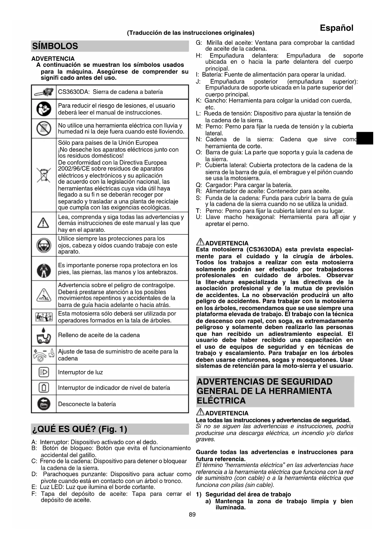 eléctricas a) No fuerce la herramienta eléctrica. Utilice la herramienta eléctrica correcta para su aplicación. La herramienta eléctrica correcta trabajará mejor y de forma más segura si se utiliza a la velocidad para la que fue diseñada. b) No utilice la herramienta eléctrica si el interruptor no la enciende y apaga. Las herramientas eléctricas que no pueden controlarse con el interruptor son peligrosas y deben repararse. c) Desconecte el enchufe de la fuente eléctrica y/o la batería de la herramienta eléctrica antes de hacer ajustes, cambiar accesorios o almacenar herramientas eléctricas. Estas medidas de seguridad preventivas reducen el riesgo de que la herramienta eléctrica se ponga en marcha accidentalmente. d) Guarde las herramientas eléctricas que no se utilicen para que no las cojan los niños y no permita que utilicen las herramientas eléctricas personas no familiarizadas con las mismas o con estas instrucciones. Las herramientas eléctricas son peligrosas si son utilizadas por usuarios sin formación. e) Mantenimiento de las herramientas eléctricas. Compruebe si las piezas móviles están mal alineadas o unidas, si hay alguna pieza rota u otra condición que pudiera afectar al funcionamiento de las herramientas eléctricas. Si la herramienta eléctrica está dañada, llévela a reparar antes de utilizarla. Se producen muchos accidentes por no realizar un mantenimiento correcto de las herramientas eléctricas. f) Mantenga las herramientas de corte afi ladas y limpias. Las herramientas de corte correctamente mantenidas con los bordes de corte afi lados son más fáciles de controlar. g) Utilice la herramienta eléctrica, los accesorios y las brocas de la herramienta, etc. de acuerdo con estas instrucciones, teniendo en cuenta las condiciones laborales y el trabajo que se va a realizar. La utilización de la herramienta eléctrica para operaciones diferentes a aquellas pretendidas podría dar lugar a una situación peligrosa. 000BookCS3630DA.indb90000BookCS3630DA.indb90 2019/07/2917:49:472019/07/2917:49:4791 Español