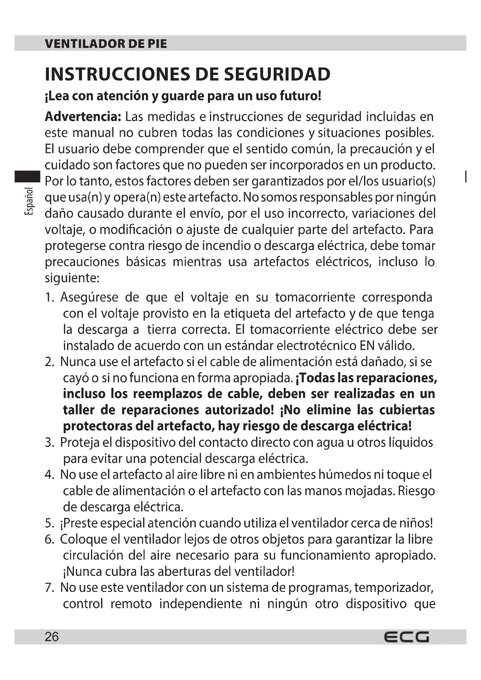 ¡Lea con atención yguarde para un uso futuro! Advertencia: Las medidas einstrucciones de seguridad incluidas en este manual no cubren todas las condiciones ysituaciones posibles. El usuario debe comprender que el sentido común, la precaución yel cuidado son factores que no pueden ser incorporados en un producto. Por lo tanto, estos factores deben ser garantizados por el/los usuario(s) que usa(n) yopera(n) este artefacto. No somos responsables por ningún daño causado durante el envío, por el uso incorrecto, variaciones del voltaje, omodicación oajuste de cualquier parte del artefacto. Para protegerse contra riesgo de incendio odescarga eléctrica, debe tomar precauciones básicas mientras usa artefactos eléctricos, incluso lo siguiente: