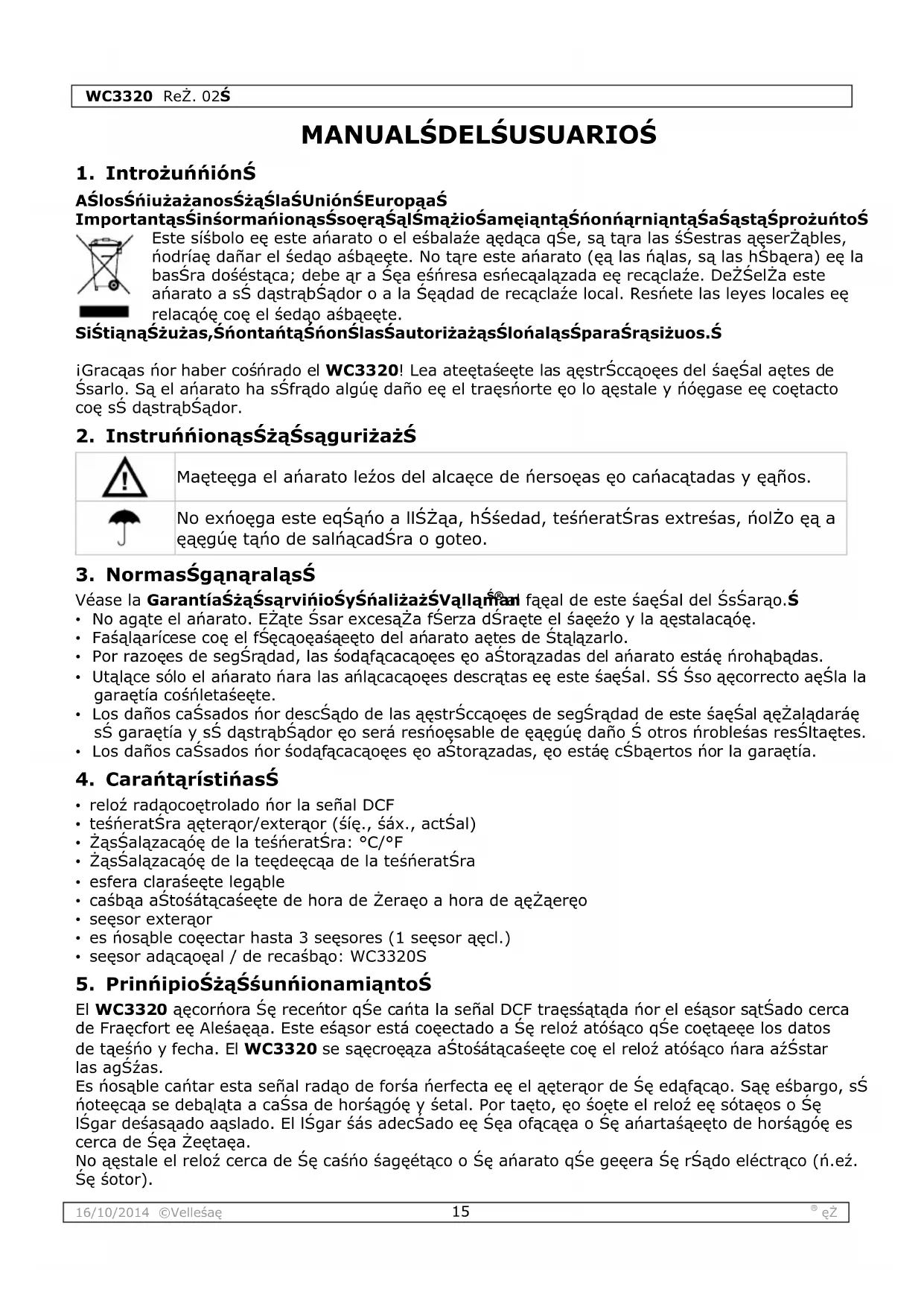 A los ciudadanos de la Unión Europea Importantes informaciones sobre el medio ambiente concerniente a este producto Este símbolo en este aparato o el embalaje indica que, si tira las muestras inservibles, podrían dañar el medio ambiente. No tire este aparato (ni las pilas, si las hubiera) en la basura doméstica; debe ir a una empresa especializada en reciclaje. Devuelva este aparato a su distribuidor o a la unidad de reciclaje local. Respete las leyes locales en relación con el medio ambiente. Si tiene dudas, contacte con las autoridades locales para residuos. ¡Gracias por haber comprado el WC3320! Lea atentamente las instrucciones del manual antes de usarlo. Si el aparato ha sufrido algún daño en el transporte no lo instale y póngase en contacto con su distribuidor.