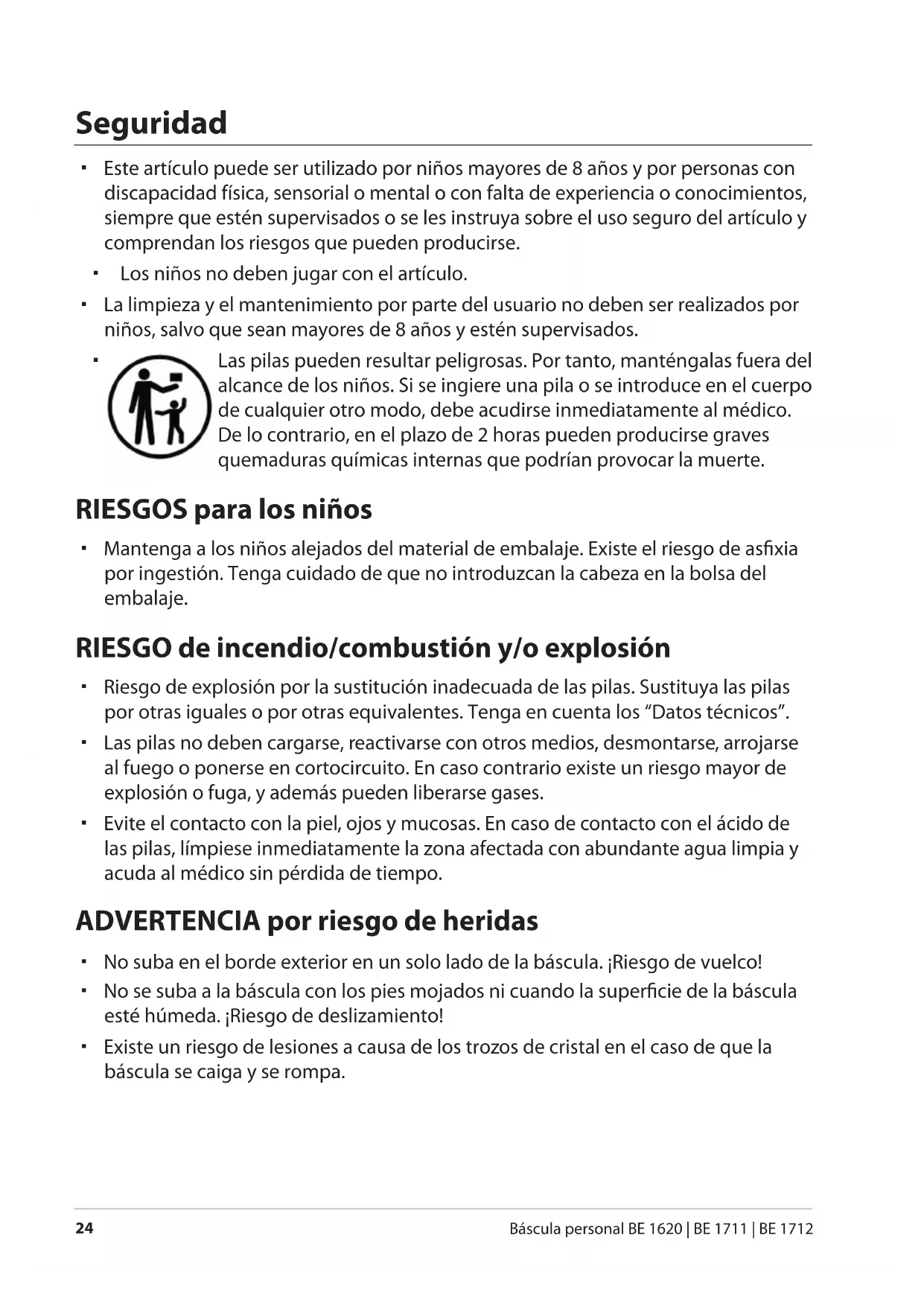 Báscula personal BE 1620 | BE 1711 | BE 1712 Seguridad Este artículo puede ser utilizado por niños mayores de 8 años y por personas con discapacidad física, sensorial o mental o con falta de experiencia o conocimientos, siempre que estén supervisados o se les instruya sobre el uso seguro del artículo y comprendan los riesgos que pueden producirse. Los niños no deben jugar con el artículo. La limpieza y el mantenimiento por parte del usuario no deben ser realizados por niños, salvo que sean mayores de 8 años y estén supervisados.