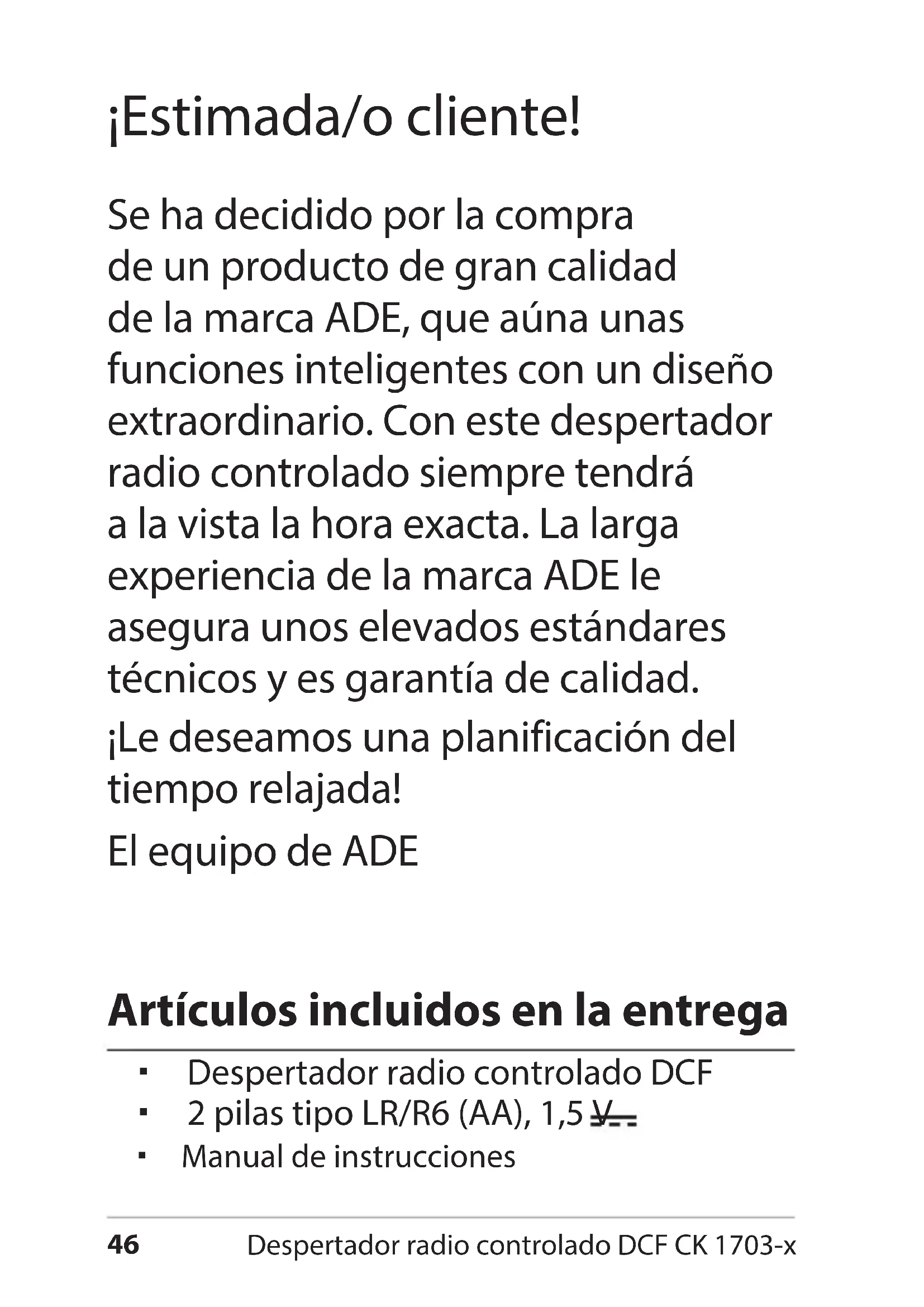 Se ha decidido por la compra de un producto de gran calidad de lamarca ADE, que aúaunas unidades inteligentes con un Diseño extraordinario. Con este descentador radio controlado siempre tendrá a la vista la hora exacta. La larga experiencia de lamarca ADE le asegura unoicos elevados estandares技术和os y es garantía de calidad.