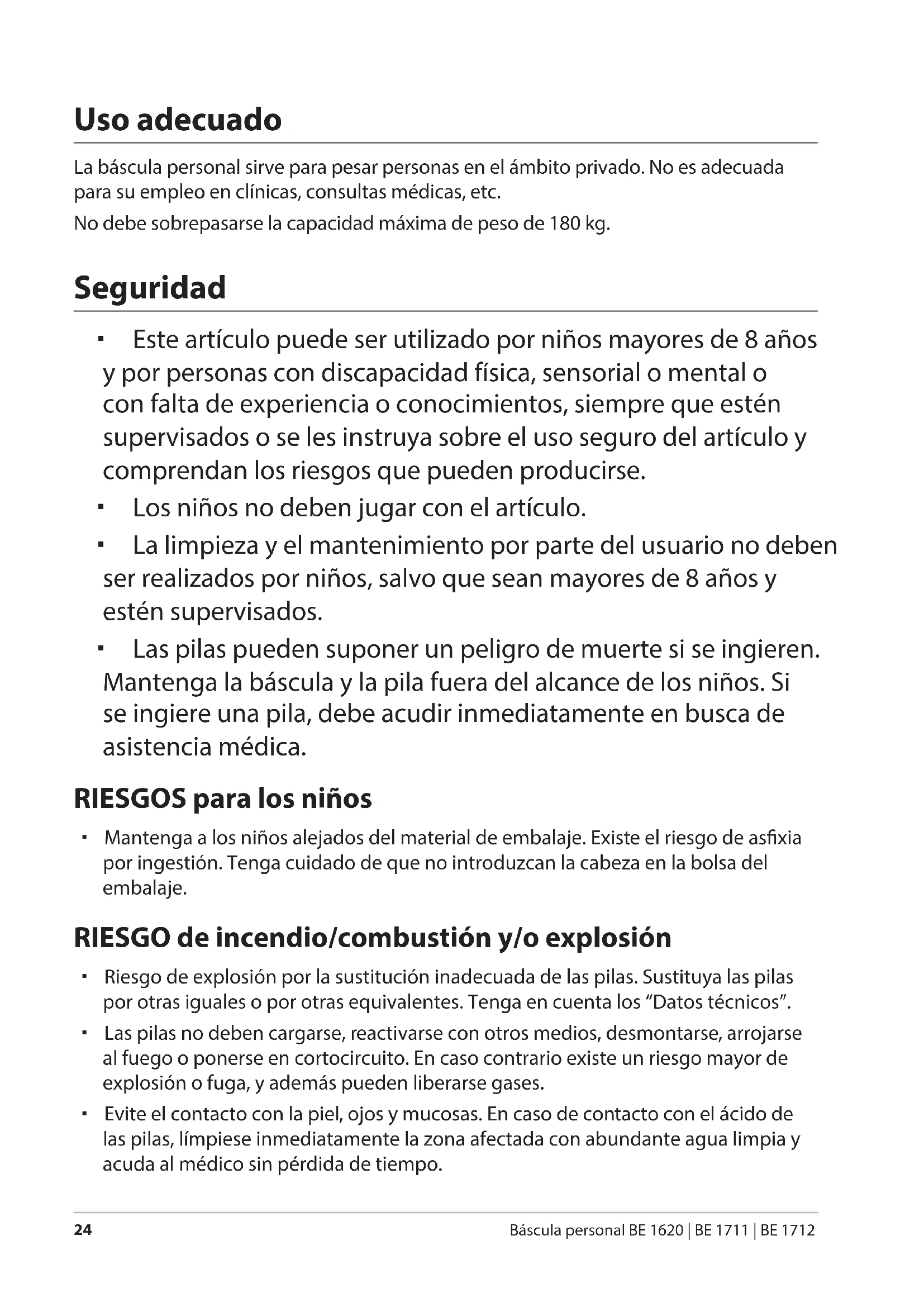 Báscula personal BE 1620 | BE 1711 | BE 1712 Uso adecuado La báscula personal sirve para pesar personas en el ámbito privado. No es adecuada para su empleo en clínicas, consultas médicas, etc. No debe sobrepasarse la capacidad máxima de peso de 180 kg. Seguridad Este artículo puede ser utilizado por niños mayores de 8 años y por personas con discapacidad física, sensorial o mental o con falta de experiencia o conocimientos, siempre que estén supervisados o se les instruya sobre el uso seguro del artículo y comprendan los riesgos que pueden producirse. Los niños no deben jugar con el artículo. La limpieza y el mantenimiento por parte del usuario no deben ser realizados por niños, salvo que sean mayores de 8 años y estén supervisados. Las pilas pueden suponer un peligro de muerte si se ingieren. Mantenga la báscula y la pila fuera del alcance de los niños. Si se ingiere una pila, debe acudir inmediatamente en busca de asistencia médica. RIESGOS para los niños Mantenga a los niños alejados del material de embalaje. Existe el riesgo de asxia por ingestión. Tenga cuidado de que no introduzcan la cabeza en la bolsa del embalaje. RIESGO de incendio/combustión y/o explosión Riesgo de explosión por la sustitución inadecuada de las pilas. Sustituya las pilas por otras iguales o por otras equivalentes. Tenga en cuenta los “Datos técnicos”. Las pilas no deben cargarse, reactivarse con otros medios, desmontarse, arrojarse al fuego o ponerse en cortocircuito. En caso contrario existe un riesgo mayor de explosión o fuga, y además pueden liberarse gases. Evite el contacto con la piel, ojos y mucosas. En caso de contacto con el ácido de las pilas, límpiese inmediatamente la zona afectada con abundante agua limpia y acuda al médico sin pérdida de tiempo. Druckbuch Personenwaage Div.indb 24 14.03.2017 12:28:06Seguridad