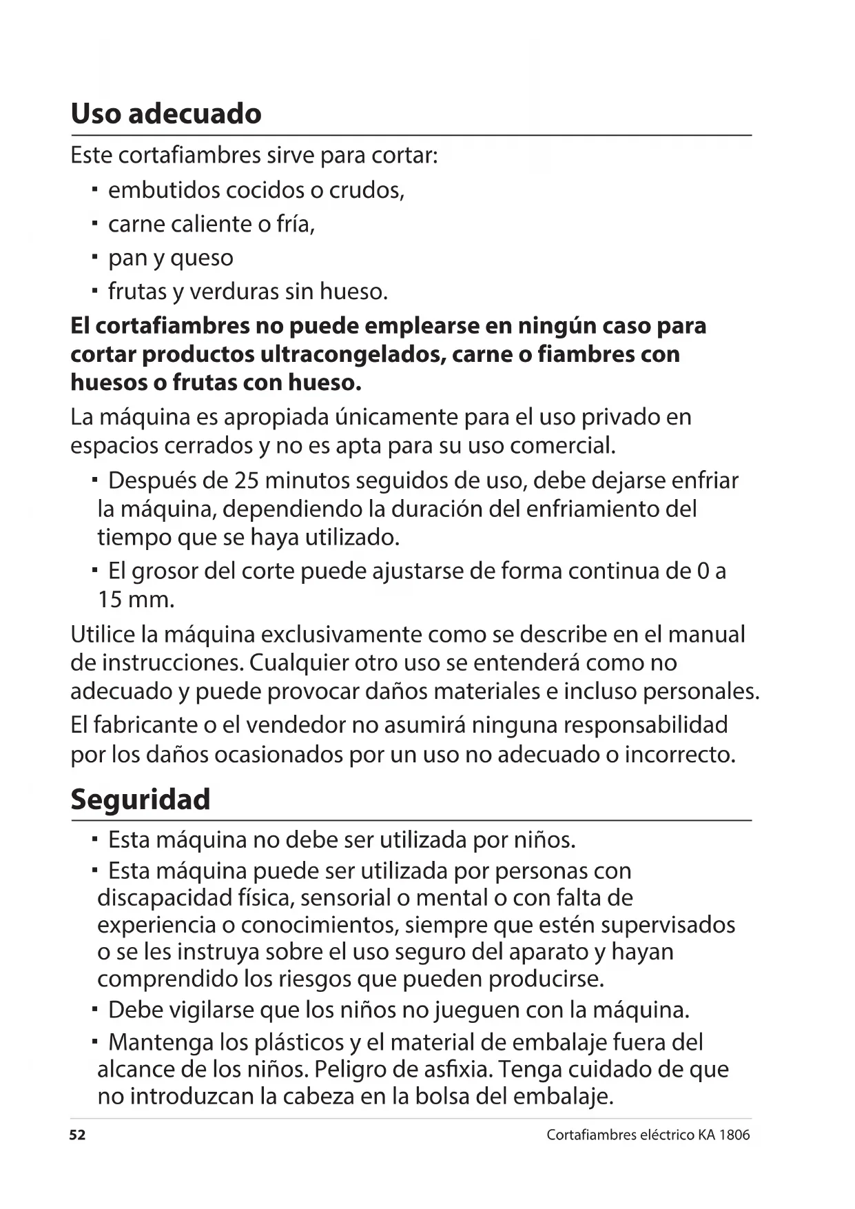El cortafiambres no puede emplearse en ningún caso para cortar productos ultracongelados, carne o fiambres con huesos o frutas con hueso.