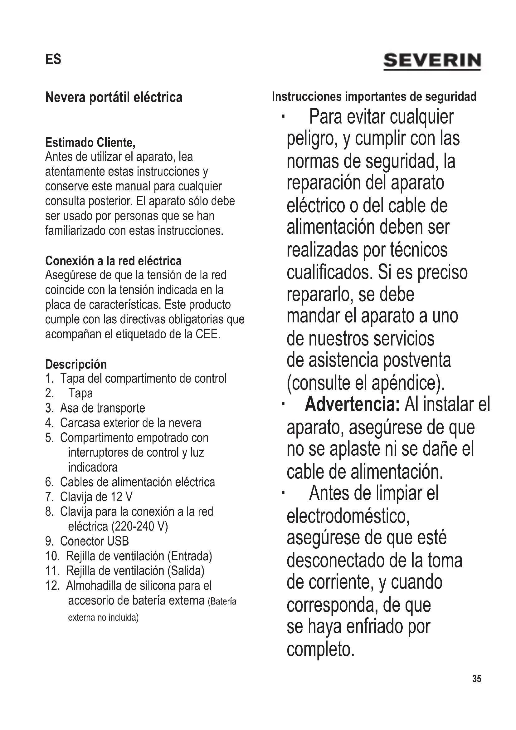 Nevera portátil eléctrica Estimado Cliente, Antes de utilizar el aparato, lea atentamente estas instrucciones y conserve este manual para cualquier consulta posterior. El aparato sólo debe ser usado por personas que se han familiarizado con estas instrucciones. Conexión a la red eléctrica Asegúrese de que la tensión de la red coincide con la tensión indicada en la placa de características. Este producto cumple con las directivas obligatorias que acompañan el etiquetado de la CEE. Descripción