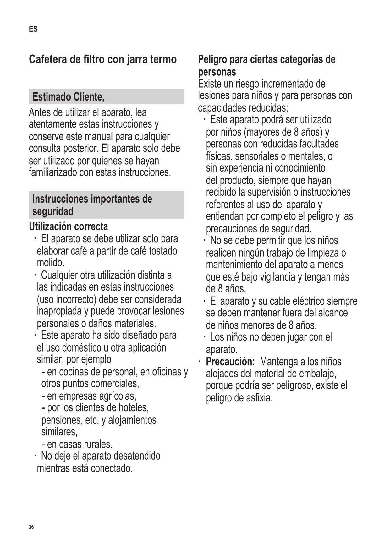 Mocht het niet mogelijk zijn met behulp van de tabel het probleem op te lossen, neem dan contact op met onze klantenservice. De contactinformatie kan gevonden worden in de bijlage van deze handleiding.36 142 x 208 mm Cafetera de ltro con jarra termo Estimado Cliente, Antes de utilizar el aparato, lea atentamente estas instrucciones y conserve este manual para cualquier consulta posterior. El aparato solo debe ser utilizado por quienes se hayan familiarizado con estas instrucciones. Instrucciones importantes de seguridad Utilización correcta ∙ El aparato se debe utilizar solo para elaborar café a partir de café tostado molido. ∙ Cualquier otra utilización distinta a las indicadas en estas instrucciones (uso incorrecto) debe ser considerada inapropiada y puede provocar lesiones personales o daños materiales. ∙ Este aparato ha sido diseñado para el uso doméstico u otra aplicación similar, por ejemplo - en cocinas de personal, en ocinas y otros puntos comerciales, - en empresas agrícolas, - por los clientes de hoteles, pensiones, etc. y alojamientos similares, - en casas rurales. ∙ No deje el aparato desatendido mientras está conectado. Peligro para ciertas categorías de personas Existe un riesgo incrementado de lesiones para niños y para personas con capacidades reducidas: ∙ Este aparato podrá ser utilizado por niños (mayores de 8 años) y personas con reducidas facultades físicas, sensoriales o mentales, o sin experiencia ni conocimiento del producto, siempre que hayan recibido la supervisión o instrucciones referentes al uso del aparato y entiendan por completo el peligro y las precauciones de seguridad. ∙ No se debe permitir que los niños realicen ningún trabajo de limpieza o mantenimiento del aparato a menos que esté bajo vigilancia y tengan más de 8 años. ∙ El aparato y su cable eléctrico siempre se deben mantener fuera del alcance de niños menores de 8 años. ∙ Los niños no deben jugar con el aparato. ∙ Precaución: Mantenga a los niños alejados del material de embalaje, porque podría ser peligroso, existe el peligro de asxia. ES37 142 x 208 mm Peligro de descarga eléctrica El aparato funciona con electricidad, por lo que siempre existe el riesgo de descarga eléctrica. Deben observarse las siguientes precauciones: ∙ Antes de utilizar el aparato, siempre se debe comprobar que tanto la unidad principal, el cable de alimentación como cualquier accesorio no están defectuosos. En caso de que el aparato haya caído sobre una supercie dura, o se haya tirado en exceso del cable de alimentación, no se deberá utilizar de nuevo: incluso los desperfectos no visibles pueden tener efectos adversos sobre la seguridad en el uso del aparato. ∙ Debe conectar este aparato solamente a una toma de corriente instalada según las normas en vigor. Asegúrese de que la tensión de la red coincide con la tensión indicada en la placa de características. ∙ Desenchufe siempre el aparato - después del uso, - si hay una avería, - antes de limpiarlo. ∙ Cuando se desenchufa la clavija de la pared, nunca tirar del cable de alimentación; sino asir siempre la clavija misma. ∙ No toque el enchufe con las manos húmedas. ∙ No sumerja el aparato en agua ni en ningún otro líquido, no la limpie debajo del grifo. Riesgo de quemaduras El aparato calienta el agua y la mantiene caliente. La supercie exterior, la parte inferior de la jarra y la base alcanzan temperaturas elevadas durante su uso, y se mantendrán calientes después de utilizarlo. Por este motivo existe el riesgo de sufrir quemaduras. Por este motivo existe el riesgo de sufrir quemaduras. ∙ No toque esos componentes durante el uso del aparato: después de utilizarlo, espere hasta que se hayan enfriado. ∙ No abra el ltro extraíble durante el uso. ∙ Antes de abrir el ltro extraíble o añadir agua, espere hasta que el aparato se haya enfriado durante 5 minutos después de utilizarlo. Falta de higiene La falta de higiene puede provocar la formación de gérmenes dentro del aparato: ∙ Limpie el aparato minuciosamente antes de utilizarlo por primera vez. ∙ Antes de limpiar el aparato, asegurarse de que esté desconectado de la red eléctrica y se haya enfriado por completo. ∙ El ltro desmontable y la jarra se deben limpiar a diario. ∙ No deje restos de agua en el recipiente. ∙ El aparato se debe descalcicar con regularidad. ∙ Se incluye información detallada sobre38 142 x 208 mm la limpieza del aparato en la sección Limpieza y mantenimiento. El aparato puede resultar dañado La manipulación incorrecta del aparato puede causar daños