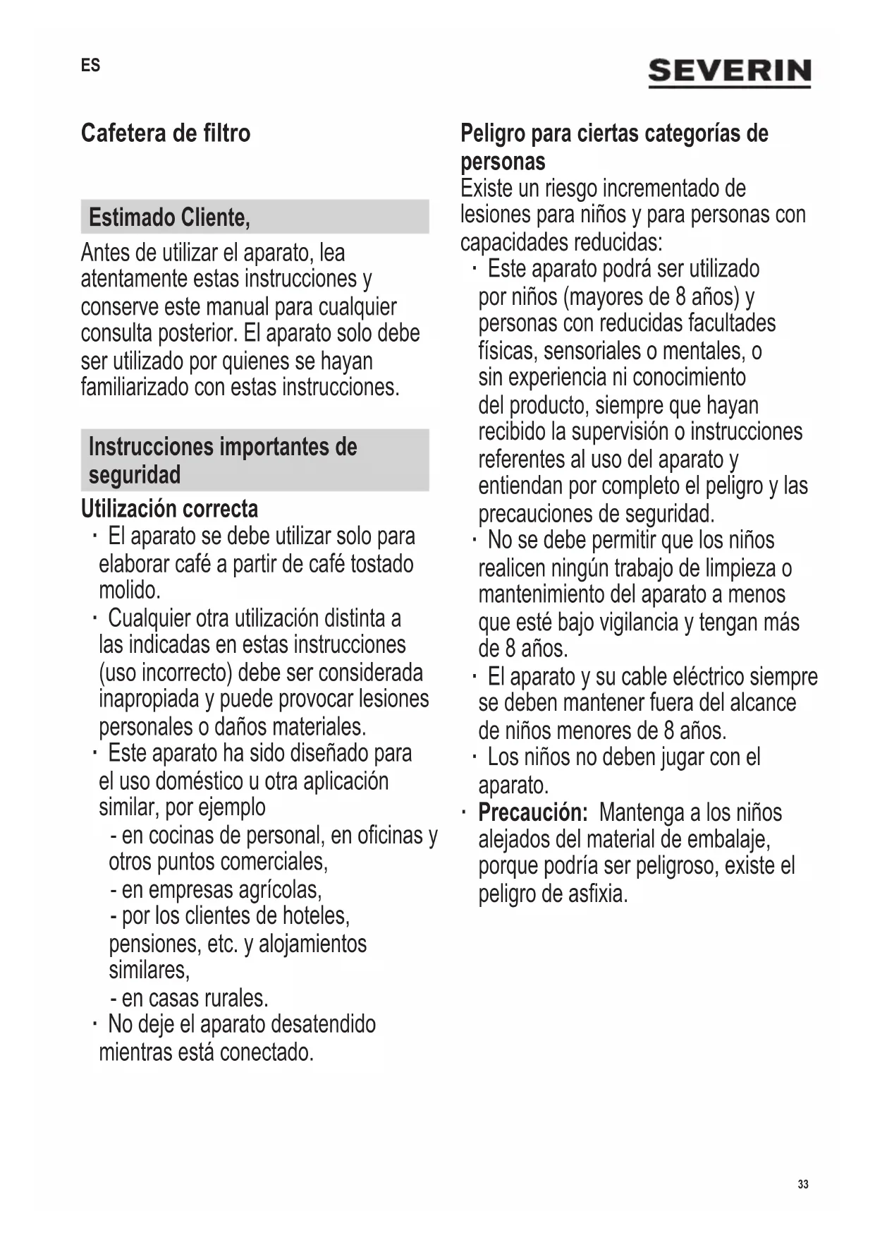 para café normal Recetas ¿Te apetece disfrutar de algunas deliciosas elaboraciones de café? o en www.severin.de/Service/Rezepte38 142 x 208 mm Limpieza y mantenimiento Descalcicación ∙ Dependiendo de la calidad del agua (contenido de cal) en su zona así como de la frecuencia con que la use, y para garantizar un funcionamiento adecuado, es necesario eliminar la cal con frecuencia de todos los aparatos domésticos termales que usan agua caliente (es decir, eliminar los residuos calizos). ∙ La garantía quedará anulada cuando el aparato no funcione correctamente debido a la no eliminación de los depósitos de cal. ∙ Si observa que aumenta el tiempo de elaboración, incrementa el ruido de la cafetera durante la elaboración del café o queda agua en el recipiente, esto indica que es necesario descalcicar la cafetera. ∙ Es muy difícil eliminar la acumulación excesiva de depósitos de cal, aun cuando se usan productos descalcicadores muy fuertes. También podrían producirse fugas en el equipo de elaboración del café. Por ello recomendamos que la cafetera se descalcique cada treinta o cuarenta ciclos de elaboración de café. ∙ Para la descalcicación se podrá usar una mezcla de vinagre de la forma siguiente: ∙ Mezcle 80 ml de vinagre concentrado con la cantidad máxima indicada de agua fría. ∙ Vierta la solución descalcicadora en el recipiente para el agua, introduzca un ltro de papel en el soporte del ltro sin añadir café molido según se describe en la sección Preparar café, y permita que el aparato complete un ciclo de ltración. Modelos con interruptor de selección de aroma: Gire el interruptor a la posición para café normal. ∙ Repita el proceso si fuera necesario. ∙ Durante la descalcicación, asegúrese de que existe suciente ventilación y no inhale el vapor del vinagre. ∙ Para limpiar la cafetera después de la descalcicación, déjela que opere durante 2 o 3 ltraciones con agua limpia (sin café molido). ∙ No tire el descalcicador en un fregadero revestido de esmalte. Limpieza diaria ∙ Antes de limpiar el aparato, asegúrese de que esté desconectado de la red eléctrica y se haya enfriado por completo. ∙ Para evitar el riesgo de una descarga eléctrica, no limpie el aparato con sustancias líquidas y no lo sumerja; no se debe limpiar bajo el grifo del agua. La cafetera se podrá limpiar con un paño ligeramente húmedo y un detergente suave. Séquela a continuación. ∙ No emplee productos de limpieza abrasivos o muy fuertes. ∙ Para extraer el café molido usado, abra el ltro extraíble, extraiga el ltro de papel y tire el café molido (esta es una sustancia natural y se puede utilizar como abono). Limpie el interior del ltro extraíble con un paño húmedo, séquelo y ciérrelo de nuevo. ∙ La jarra con tapa y el ltro desmontable se pueden limpiar con agua templada o en el lavavajillas después de utilizarlos. ∙ Para facilitar su limpieza, abra la tapa de la jarra y extráigala tirando de ella hacia arriba. Vuelva a colocarla después de limpiarla, ejerciendo una ligera presión.39 142 x 208 mm Eliminación Los dispositivos en los que gura este símbolo deben ser eliminados por separado de la basura doméstica, porque contienen componentes valiosos que pueden ser reciclados. La eliminación correcta ayuda a proteger el medio ambiente y la salud de las personas. Consulte a las autoridades municipales o el establecimiento de venta donde podrán facilitarle la información relevante. Los aparatos eléctricos que ya no son utilizables se pueden entregar gratuitamente en el establecimiento de venta. Garantía Este producto está garantizado por un período de dos años, contado a partir de la fecha de compra, contra cualquier defecto en materiales o mano de obra. Esta garantía sólo es válida si el aparato ha sido utilizado siguiendo las instrucciones de uso, siempre que no haya sido modicado, reparado o manipulado por cualquier persona no autorizada o haya sido estropeado como consecuencia de un uso inadecuado del mismo. Naturalmente esta garantía no cubre las averías debidas a uso o desgaste normales, así como aquellas piezas de fácil rotura tales como cristales, piezas cerámicas, etc. Esta garantía no afecta a los derechos legales del consumidor ante la falta de conformidad del producto con el contrato de compraventa.40 142 x 208 mm Resolución de problemas Problema Causa Remedio No se activa ninguna función. El aparato no está conectado. Conecte el aparato a la toma de corriente. Toma eléctrica defectuosa. Compruebe que la toma funciona con otro aparato. El aparato se apaga antes de nalizar el proceso de elaboración de café; queda agua en el recipiente. Es necesario descalcicar el aparato. Descalcique el aparato (consulte Limpieza y mantenimiento). No sale café por el ltro extraíble. La jarra de cristal no está correctamente colocada debajo de la salida. Compruebe que la jarra está correctamente colocada en la placa térmica, empujando la válvula de salida hacia arriba. No hay suciente agua. Añada agua. Sale agua por el ltro extraíble. El café está demasiado namente molido. Seleccione un nivel de molienda más grueso. El café no es sucientemente espeso. Se ha utilizado muy poco café molido. Incremente la cantidad. El ltro de papel se ha colocado incorrectamente o se ha caído. Antes de colocarlo, doble los lados punteados. Modelos con interruptor de selección de aroma: Interruptor mal ajustado