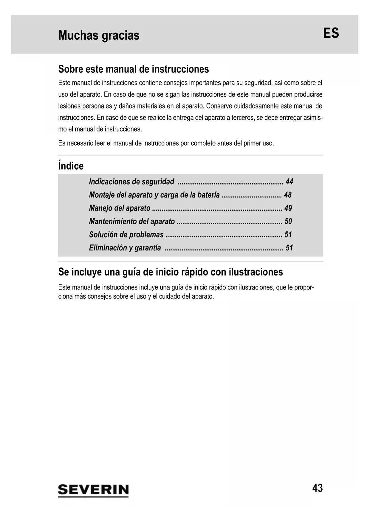 - Apparaat en accu afzonderlijk verwijderen Apparaten en accu’s, die met dit symbool zijn aangeduid, moeten gescheiden van het huisvuil worden verwijderd! Apparaten en accu’s bevatten waardevolle materia- len, die gerecycled kunnen worden. Een correcte verwijdering beschermt het milieu en de gezondheid van de medemens. Het apparaat en de uitgebouwde accu afzon- derlijk voor verwijdering naar de overeenkomstige inzamelpunten brengen. Garantie De wettelijke garantierechten voor de verkoper en evt. verkopergaranties worden niet aangetast door de onderstaande garantievoorwaarden. Mocht reparatie nodig zijn, neem telefonisch of via e-mail contact op met onze klantenser- vice. De contactgegevens vindt u in de bijlage van deze handleiding. Bij garantiegevallen kunt u als alternatief ook direct contact opnemen met de dealer. Bovendien geeft SEVERIN een fa- brieksgarantie van twee jaar vanaf de datum van aankoop. In deze periode repareren wij kosteloos alle gebreken, die aantoonbaar veroorzaakt worden door materiaal- of productiefouten en die de werking aanzienlijk verminderen. Verdere claims zijn uitgesloten. Van garantie uitgesloten is: Schade, die terug te voeren is op de niet-inachtneming van de handlei- ding, ondeskundige behandeling of normale slijtage, evenals licht breekbare onderdelen zoals glas, kunststof of LED’s. Van de garantie uitgesloten zijn bovendien batterijen en accu’s die als gevolg van normale slijtage of ondeskundig gebruik defect zijn geraakt resp. waarvan de looptijd is verkort. De garantie komt te vervallen bij ingreep door instanties die niet door SEVERIN geautoriseerd zijn.43 Muchas gracias 1 Muchas gracias Sobre este manual de instrucciones Este manual de instrucciones contiene consejos importantes para su seguridad, así como sobre el uso del aparato. En caso de que no se sigan las instrucciones de este manual pueden producirse lesiones personales y daños materiales en el aparato. Conserve cuidadosamente este manual de instrucciones. En caso de que se realice la entrega del aparato a terceros, se debe entregar asimis- mo el manual de instrucciones. Es necesario leer el manual de instrucciones por completo antes del primer uso. Índice Indicaciones de seguridad p. 44