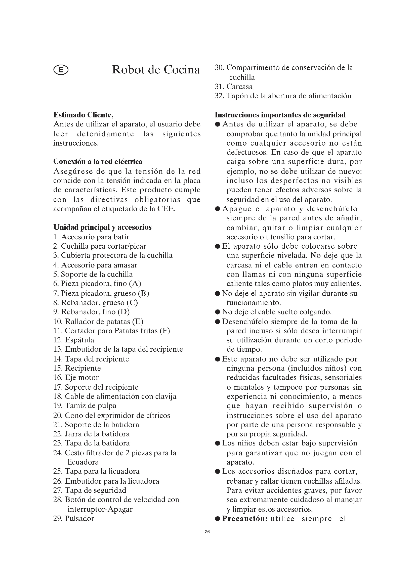 Instrucciones importantes de seguridad ● Antes de utilizar el aparato, se debe comprobar que tanto la unidad principal como cualquier accesorio no están defectuosos. En caso de que el aparato caiga sobre una superficie dura, por ejemplo, no se debe utilizar de nuevo: incluso los desperfectos no visibles pueden tener efectos adversos sobre la seguridad en el uso del aparato. ● Apague el aparato y desenchúfelo siempre de la pared antes de añadir, cambiar, quitar o limpiar cualquier accesorio o utensilio para cortar. ● El aparato sólo debe colocarse sobre una superficie nivelada. No deje que la carcasa ni el cable entren en contacto con llamas ni con ninguna superficie caliente tales como platos muy calientes. ● No deje el aparato sin vigilar durante su funcionamiento. ● No deje el cable suelto colgando. ● Desenchúfelo siempre de la toma de la pared incluso si sólo desea interrumpir su utilización durante un corto periodo de tiempo. ● Este aparato no debe ser utilizado por ninguna persona (incluidos niños) con reducidas facultades físicas, sensoriales o mentales y tampoco por personas sin experiencia ni conocimiento, a menos que hayan recibido supervisión o instrucciones sobre el uso del aparato por parte de una persona responsable y por su propia seguridad. ● Los niños deben estar bajo supervisión para garantizar que no juegan con el aparato. ● Los accesorios diseñados para cortar, rebanar y rallar tienen cuchillas afiladas. Para evitar accidentes graves, por favor sea extremamente cuidadoso al manejar y limpiar estos accesorios. ● Precaución: utilice siempre el