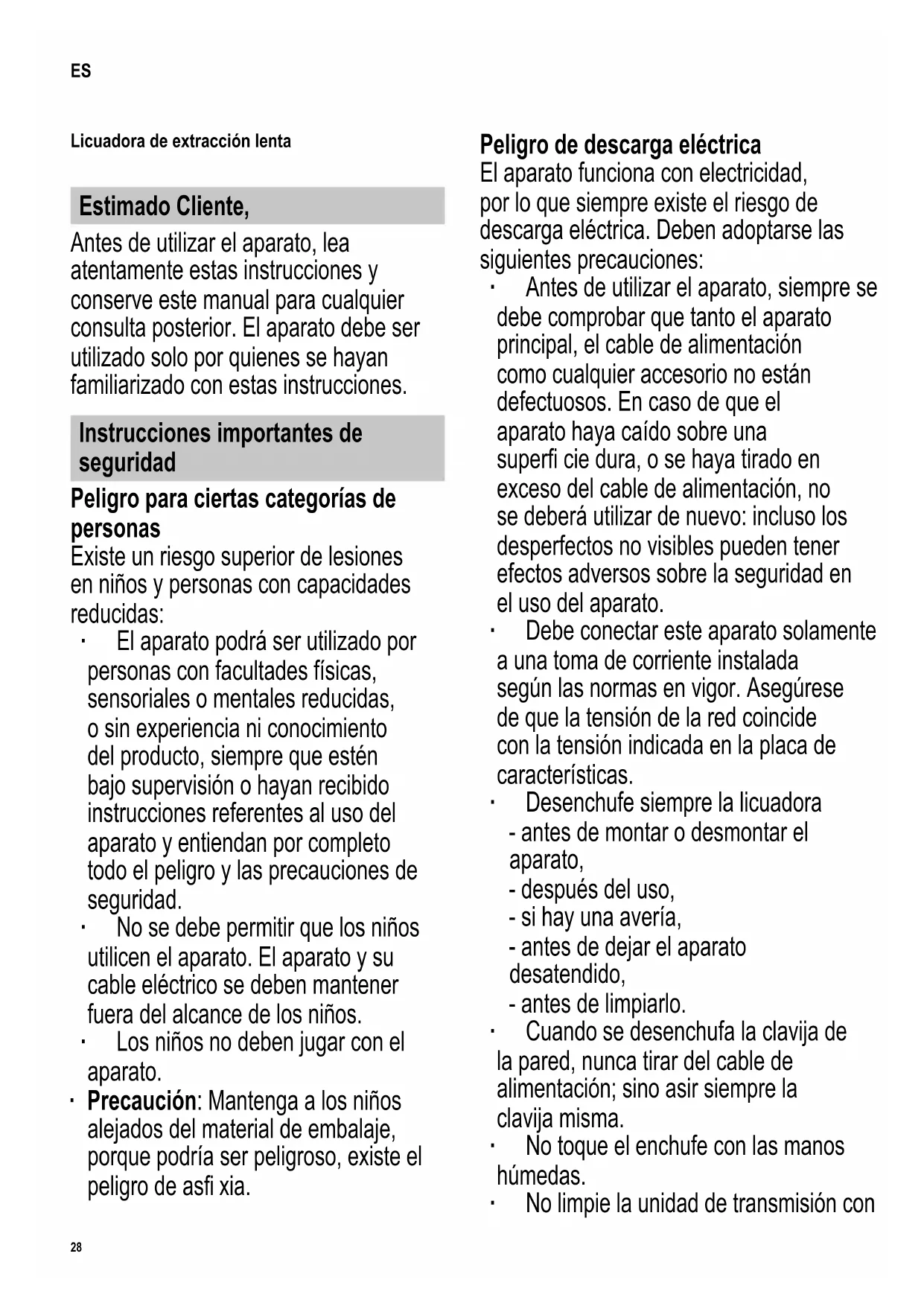 ∙ No permita que el cable cuelgue suelto. ∙ No retuerza ni apriete el cable de alimentación eléctrica. Mantenga ambos, el cable y el aparato lejos de cualquier foco de calor (por ejemplo, platos calientes, llamas de gas). ∙ No extraer zumo de alimentos calientes. ∙ Utilice solo accesorios originales. Utilización correcta ∙ Este aparato solo debe ser utilizado para extraer zumo de verduras y frutas , y para preparar sorbetes de frutas o verduras ultra congeladas. También es adecuado para preparar purés de fruta (compotas) para mermelada o salsas. ∙ Precaución: El aparato no está diseñado para procesar alimentos duros como frutos secos o cubitos de hielo. ∙ Cualquier otra utilización distinta a las indicadas en estas instrucciones debe ser considerada inapropiada y puede provocar lesiones personales o daños materiales. ∙ Este aparato ha sido diseñado para el uso doméstico u otra aplicación similar, por ejemplo30 - en cocinas de personal, en ofi cinas y otros puntos comerciales, - en empresas agrícolas, - por los clientes de hoteles, pensiones, etc. y alojamientos similares, - en casas rurales. ∙ No deje el aparato desatendido mientras está conectado. ∙ Precaución: El uso incorrecto puede provocar lesiones personales graves. En caso de que el aparato esté defectuoso Un aparato defectuoso puede causar daños materiales y lesiones