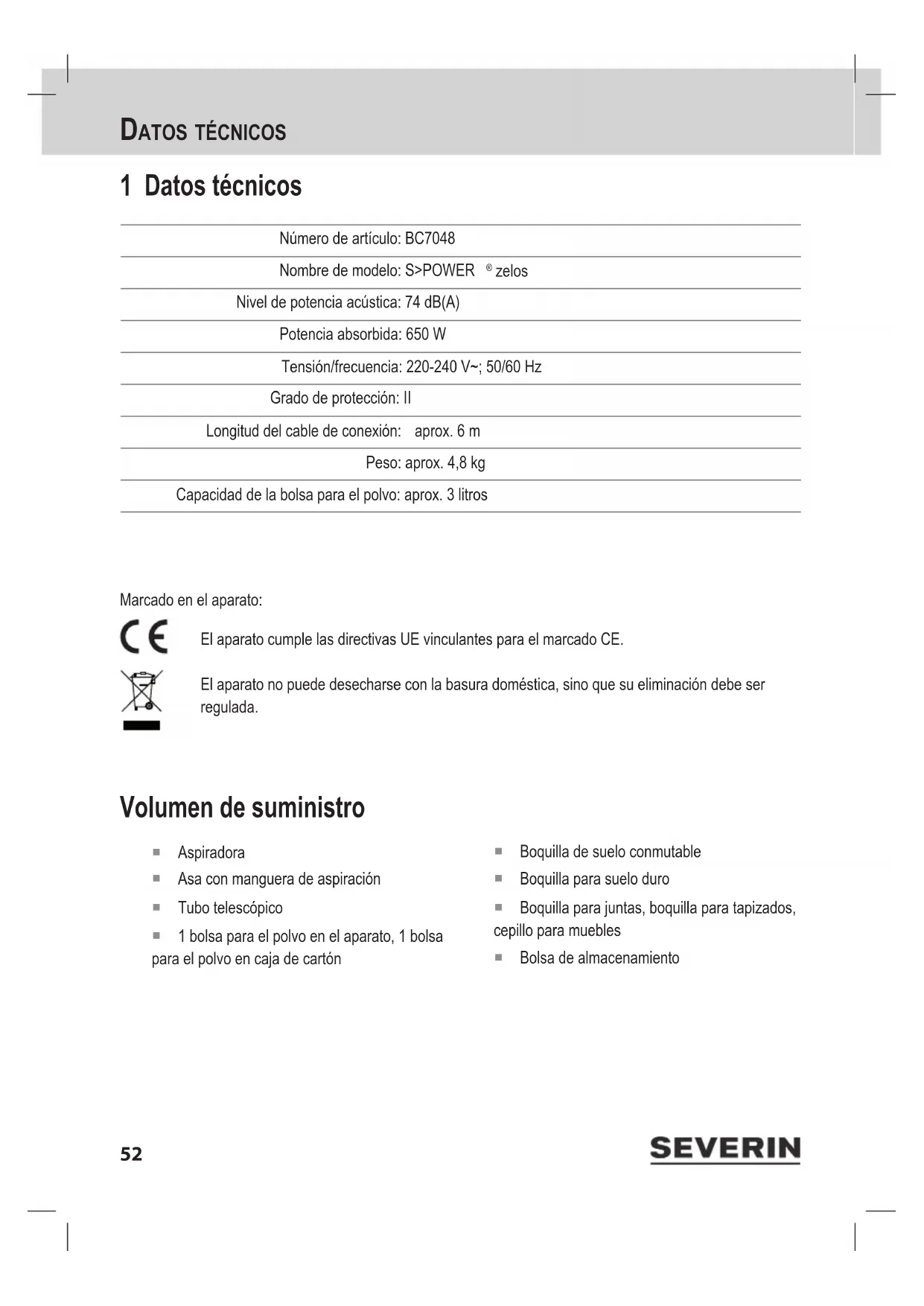 Ya puede volver a utilizar el aparato ya enfriado. El aparato prácticamente no aspira suciedad o la potencia de aspiración desciende notablemente. Hay que cambiar la bolsa para el polvo («Cambio de la bolsa para el polvo» en la página 57). Se recomienda aprovechar la ocasión para limpiar los ltros («Limpieza del ltro del motor» en la página 58, «Limpieza del ltro de soplado» en la página 58). La potencia de aspiración seleccionada puede no ser adecuada para el revestimiento de suelo aspirado. Ajuste la potencia de aspiración correcta («Ajuste de la potencia de aspi- ración» en la página 57).61 eliminación Problema Causa/solución El aparato prácticamente no aspira suciedad o la potencia de aspiración desciende notablemente. La boquilla insertada puede no ser adecuada para el revestimiento de suelo aspirado. Seleccione y coloque la boquilla correcta. Con la boquilla de suelo insertada, el conmutador «Alfombra/suelo duro» se encuentra en una posición que no es adecuada para el revestimiento aspirado. Seleccione la posición correcta del conmutador. No es posible cerrar la tapa del aparato. La bolsa sobresale e impide que la tapa se cierre. En ese caso, inserte la bolsa por completo en el aparato. Si esta tabla no le ayuda, diríjase a nuestro servicio de atención al cliente. Puede encontrar los datos de contacto en el anexo de este manual de instrucciones o en www.severin.de. 7 Eliminación Los aparatos identicados con este símbolo deben eliminarse por separado de la basura doméstica. Estos aparatos contienen materia prima valiosa que puede reutilizarse. Una gestión de residuos correcta protege el medio ambiente y la salud de sus congéneres. La administra- ción municipal o su distribuidor especializado le proporcionarán información sobre la gestión de residuos adecuada. 8 Garantía Las siguientes condiciones de garantía no afectan a los derechos de garantía legal frente al vendedor y a otras posibles garantías del vendedor. Si resulta necesaria una reparación, póngase en contacto con nuestro servicio de atención al cliente por teléfono o por correo electrónico. Puede encontrar los datos de contacto en el anexo de este manual de instrucciones. En caso de garantía, también puede dirigirse directamente al distribuidor. Además, SEVERIN concede una garantía de fabricantes de dos años a partir de la fecha de la compra. Durante ese plazo de tiempo eliminaremos de forma gratuita cualquier deciencia que pueda demostrarse que se debe a un fallo de material o de fabricación e impida un funcionamiento normal. Queda excluido cualquier otro derecho de reclamación. Quedan excluidos de la garantía: Los daños que se deban a la inobservancia del manual de instrucciones, la manipulación incorrecta o el desgaste normal, así como los referidos a piezas frágiles como cristal, plástico o bombillas. La garantía se extingue en caso de intervención por parte de instancias no autorizadas por SEVERIN.62 Grazie Gentile cliente, grazie per la ducia accordataci. Ci auguriamo che possa apprezzare appieno questo prodotto di qualità SEVERIN. Per conoscere la varietà dei prodotti SEVERIN visitate il nostro sito Web www.severin-oorcare.com. La direzione commerciale e i dipendenti di SEVERIN Floorcare GmbH63 Informazioni sulle presenti istruzioni per l’uso Le istruzioni per l’uso contengono importanti suggerimenti per la sicurezza dell’utilizzatore nonché per l’uso dell’apparecchio. Il mancato rispetto delle istruzioni per l’uso può causare lesioni alle persone o danni all’ap- parecchio. Conservare le istruzioni per l’uso in modo accurato. Nel caso di cessione dell’apparecchio a terzi, consegnare anche le istruzioni per l’uso. Prima di utilizzare l’apparecchio per la prima volta, leggere l’intero contenuto delle istruzioni per l’uso. Con guida rapida illustrata allegata Alle presenti istruzioni per l’uso è allegata una Guida rapida illustrata contenente ulteriori suggerimenti per l’uso e la cura dell’apparecchio. Se necessario, le presenti istruzioni per l’uso e la Guida rapida illustrata possono essere scaricate gratuita- mente dal sito Web www.severin.com. Indice 1 Dati tecnici 64 2 Avvertenze di sicurezza 65 3 Aspirazione della polvere 68 4 Pulizia e manutenzione dell’apparecchio 70 5 Pezzi di ricambio/accessori 71 6 Eliminazione autonoma di problemi 72 7 Smaltimento 73 8 Garanzia 7364 DaTi Tecnici 1 Dati tecnici Numero articolo: BC7048 Nome modello: S>POWER