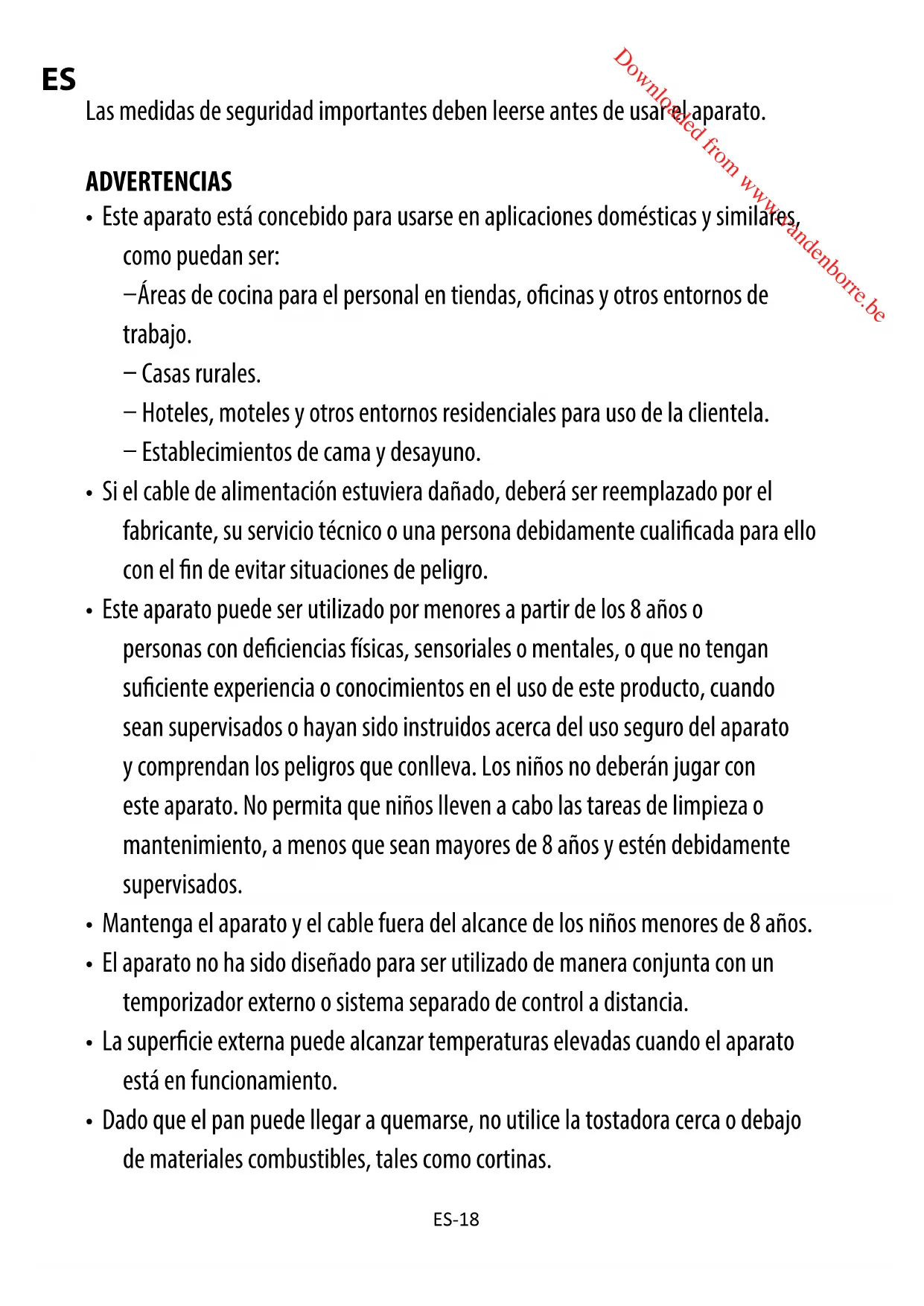 - Dado que el pan puede llegar a quemarse, no utilice la tostadora cerca o debajo de materiales combustibles, tales como cortinas. Downloaded from www.vandenborre.beES-19