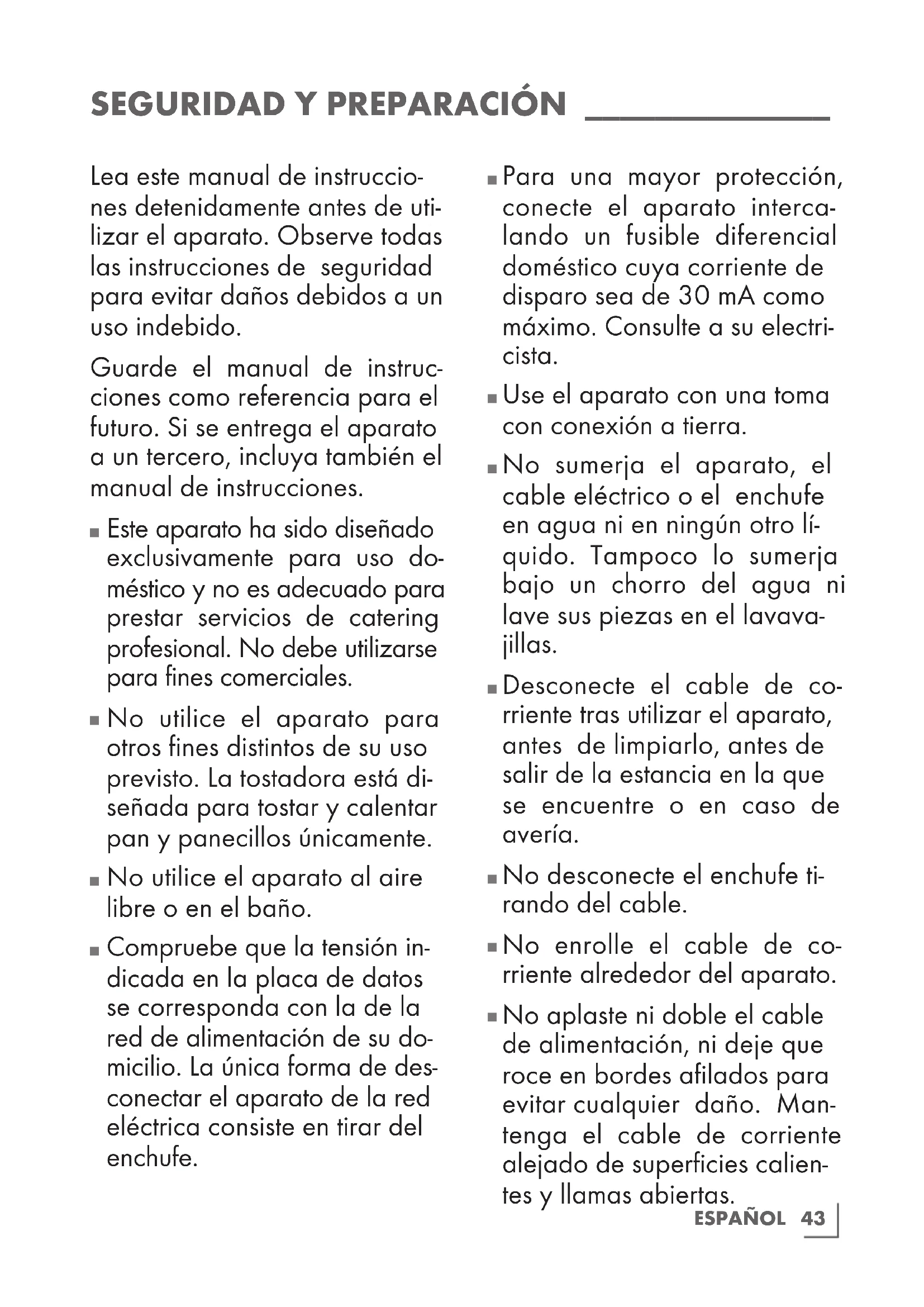 No utilice el aparato para otros fines distintos de su uso previsto. La tostadora está di- señada para tostar y calentar pan y panecillos únicamente.
